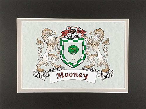 Mooney Irish Coat of Arms Print - Frameable 9" x 12" Authentic Irish coat of arms frameable 9" x 12" inch print. Four piece set includes a high-quality print of your Irish family coat of arms on a heavy 65lb cover weight parchment paper, heavy all-black backing board, and TWO separate matboards. Fits any standard 9" x 12" frame. Authentic Irish coat of arms printPrinted from high quality Vector art filesHeavy duty all-black backing boardNo mounting necessaryTwo separate matboards (inside color: clay, outside color: dark olive)9" x 12" frameable sizeShrink wrapped for deliveryChoose from over 1200 available Irish coat of arms.