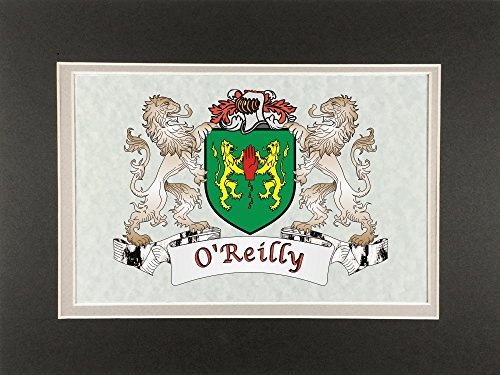 O'Reilly Irish Coat of Arms Print - Frameable 9" x 12" Authentic Irish coat of arms frameable 9" x 12" inch print. Four piece set includes a high-quality print of your Irish family coat of arms on a heavy 65lb cover weight parchment paper, heavy all-black backing board, and TWO separate matboards. Fits any standard 9" x 12" frame. Authentic Irish coat of arms printPrinted from high quality Vector art filesHeavy duty all-black backing boardNo mounting necessaryTwo separate matboards (inside color: clay, outside color: dark olive)9" x 12" frameable sizeShrink wrapped for deliveryChoose from over 1200 available Irish coat of arms.