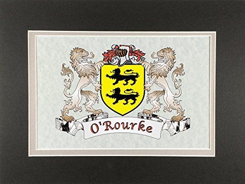 O'Rourke Irish Coat of Arms Print - Frameable 9" x 12" Authentic Irish coat of arms frameable 9" x 12" inch print. Four piece set includes a high-quality print of your Irish family coat of arms on a heavy 65lb cover weight parchment paper, heavy all-black backing board, and TWO separate matboards. Fits any standard 9" x 12" frame. Authentic Irish coat of arms printPrinted from high quality Vector art filesHeavy duty all-black backing boardNo mounting necessaryTwo separate matboards (inside color: clay, outside color: dark olive)9" x 12" frameable sizeShrink wrapped for deliveryChoose from over 1200 available Irish coat of arms.