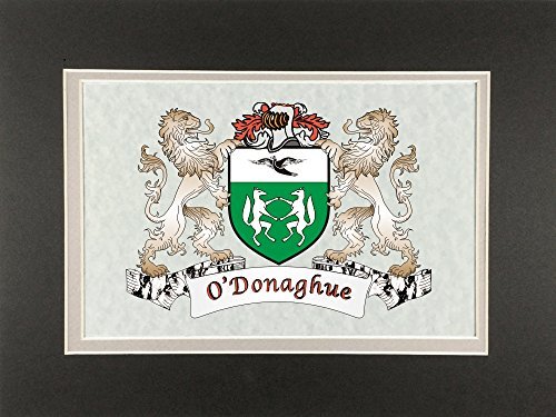 ODonaghue Irish Coat of Arms Print - Frameable 9" x 12" Authentic Irish coat of arms frameable 9" x 12" inch print. Four piece set includes a high-quality print of your Irish family coat of arms on a heavy 65lb cover weight parchment paper, heavy all-black backing board, and TWO separate matboards. Fits any standard 9" x 12" frame. Authentic Irish coat of arms printPrinted from high quality Vector art filesHeavy duty all-black backing boardNo mounting necessaryTwo separate matboards (inside color: clay, outside color: dark olive)9" x 12" frameable sizeShrink wrapped for deliveryChoose from over 1200 available Irish coat of arms.