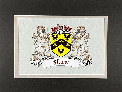 Shaw Irish Coat of Arms Print - Frameable 9" x 12" Authentic Irish coat of arms frameable 9" x 12" inch print. Four piece set includes a high-quality print of your Irish family coat of arms on a heavy 65lb cover weight parchment paper, heavy all-black backing board, and TWO separate matboards. Fits any standard 9" x 12" frame. Authentic Irish coat of arms printPrinted from high quality Vector art filesHeavy duty all-black backing boardNo mounting necessaryTwo separate matboards (inside color: clay, outside color: dark olive)9" x 12" frameable sizeShrink wrapped for deliveryChoose from over 1200 available Irish coat of arms.