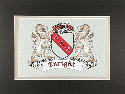 Enright Irish Coat of Arms Print - Frameable 9" x 12" Authentic Irish coat of arms frameable 9" x 12" inch print. Four piece set includes a high-quality print of your Irish family coat of arms on a heavy 65lb cover weight parchment paper, heavy all-black backing board, and TWO separate matboards. Fits any standard 9" x 12" frame. Authentic Irish coat of arms printPrinted from high quality Vector art filesHeavy duty all-black backing boardNo mounting necessaryTwo separate matboards (inside color: clay, outside color: dark olive)9" x 12" frameable sizeShrink wrapped for deliveryChoose from over 1200 available Irish coat of arms.