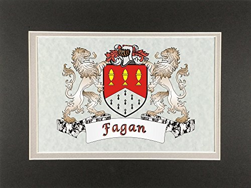 Fagan Irish Coat of Arms Print - Frameable 9" x 12" Authentic Irish coat of arms frameable 9" x 12" inch print. Four piece set includes a high-quality print of your Irish family coat of arms on a heavy 65lb cover weight parchment paper, heavy all-black backing board, and TWO separate matboards. Fits any standard 9" x 12" frame. Authentic Irish coat of arms printPrinted from high quality Vector art filesHeavy duty all-black backing boardNo mounting necessaryTwo separate matboards (inside color: clay, outside color: dark olive)9" x 12" frameable sizeShrink wrapped for deliveryChoose from over 1200 available Irish coat of arms.