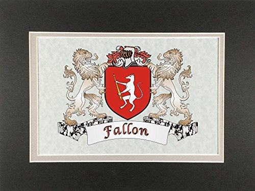 Fallon Irish Coat of Arms Print - Frameable 9" x 12" Authentic Irish coat of arms frameable 9" x 12" inch print. Four piece set includes a high-quality print of your Irish family coat of arms on a heavy 65lb cover weight parchment paper, heavy all-black backing board, and TWO separate matboards. Fits any standard 9" x 12" frame. Authentic Irish coat of arms printPrinted from high quality Vector art filesHeavy duty all-black backing boardNo mounting necessaryTwo separate matboards (inside color: clay, outside color: dark olive)9" x 12" frameable sizeShrink wrapped for deliveryChoose from over 1200 available Irish coat of arms.