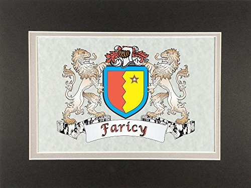 Faricy Irish Coat of Arms Print - Frameable 9" x 12" Authentic Irish coat of arms frameable 9" x 12" inch print. Four piece set includes a high-quality print of your Irish family coat of arms on a heavy 65lb cover weight parchment paper, heavy all-black backing board, and TWO separate matboards. Fits any standard 9" x 12" frame. Authentic Irish coat of arms printPrinted from high quality Vector art filesHeavy duty all-black backing boardNo mounting necessaryTwo separate matboards (inside color: clay, outside color: dark olive)9" x 12" frameable sizeShrink wrapped for deliveryChoose from over 1200 available Irish coat of arms.