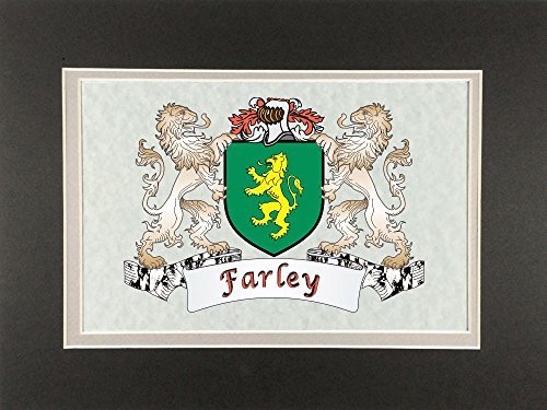 Farley Irish Coat of Arms Print - Frameable 9" x 12" Authentic Irish coat of arms frameable 9" x 12" inch print. Four piece set includes a high-quality print of your Irish family coat of arms on a heavy 65lb cover weight parchment paper, heavy all-black backing board, and TWO separate matboards. Fits any standard 9" x 12" frame. Authentic Irish coat of arms printPrinted from high quality Vector art filesHeavy duty all-black backing boardNo mounting necessaryTwo separate matboards (inside color: clay, outside color: dark olive)9" x 12" frameable sizeShrink wrapped for deliveryChoose from over 1200 available Irish coat of arms.