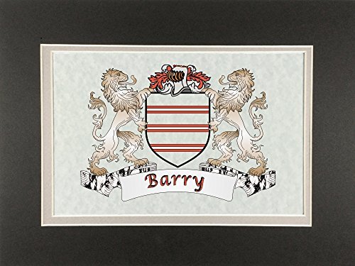 Barry Irish Coat of Arms Print - Frameable 9" x 12" Authentic Irish coat of arms frameable 9" x 12" inch print. Four piece set includes a high-quality print of your Irish family coat of arms on a heavy 65lb cover weight parchment paper, heavy all-black backing board, and TWO separate matboards. Fits any standard 9" x 12" frame. Authentic Irish coat of arms printPrinted from high quality Vector art filesHeavy duty all-black backing boardNo mounting necessaryTwo separate matboards (inside color: clay, outside color: dark olive)9" x 12" frameable sizeShrink wrapped for deliveryChoose from over 1200 available Irish coat of arms.