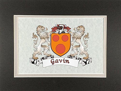 Gavin Irish Coat of Arms Print - Frameable 9" x 12" Authentic Irish coat of arms frameable 9" x 12" inch print. Four piece set includes a high-quality print of your Irish family coat of arms on a heavy 65lb cover weight parchment paper, heavy all-black backing board, and TWO separate matboards. Fits any standard 9" x 12" frame. Authentic Irish coat of arms printPrinted from high quality Vector art filesHeavy duty all-black backing boardNo mounting necessaryTwo separate matboards (inside color: clay, outside color: dark olive)9" x 12" frameable sizeShrink wrapped for deliveryChoose from over 1200 available Irish coat of arms.