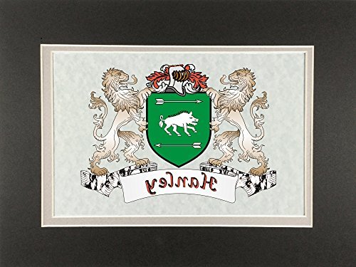 Hanley Irish Coat of Arms Print - Frameable 9" x 12" Authentic Irish coat of arms frameable 9" x 12" inch print. Four piece set includes a high-quality print of your Irish family coat of arms on a heavy 65lb cover weight parchment paper, heavy all-black backing board, and TWO separate matboards. Fits any standard 9" x 12" frame. Authentic Irish coat of arms printPrinted from high quality Vector art filesHeavy duty all-black backing boardNo mounting necessaryTwo separate matboards (inside color: clay, outside color: dark olive)9" x 12" frameable sizeShrink wrapped for deliveryChoose from over 1200 available Irish coat of arms.