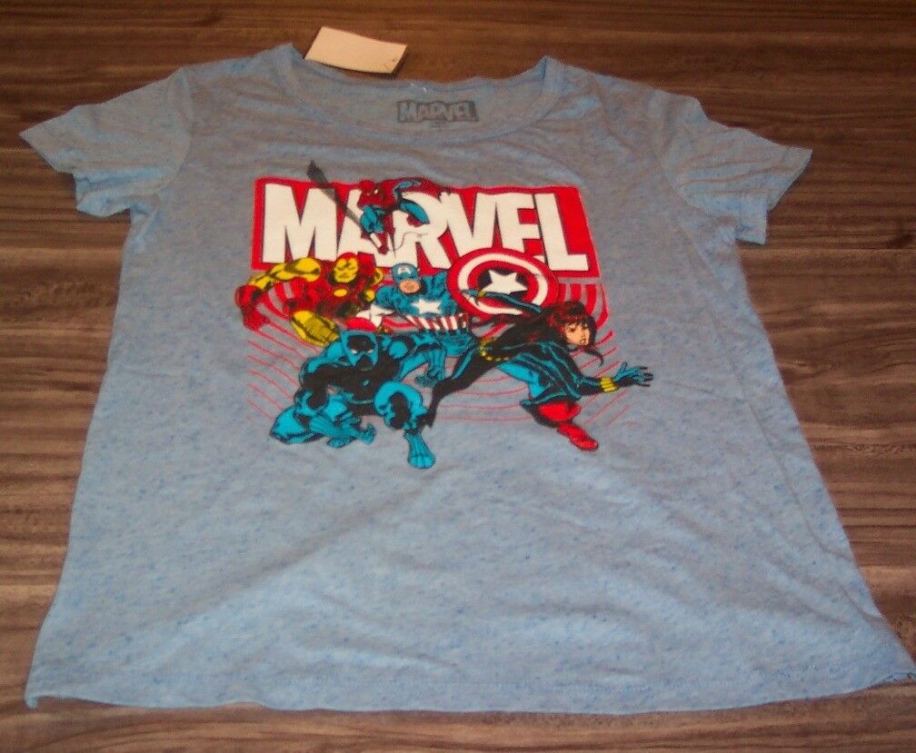 This is a VINTAGE STYLE WOMEN'S TEEN Marvel Comics THE AVENGERS CAPTAIN AMERICA, BLACK WIDOW, THE MIGHTY THOR, THE BLACK PANTHER, THE AMAZING SPIDER-MAN, T-shirt. It is a Size SMALL and is NEW with the tag. It is 17 inches from armpit to armpit and 23 inches in length. Combine auctions to save on shipping. AG