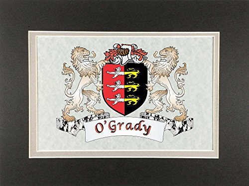 OGrady Irish Coat of Arms Print - Frameable 9" x 12" Authentic Irish coat of arms frameable 9" x 12" inch print. Four piece set includes a high-quality print of your Irish family coat of arms on a heavy 65lb cover weight parchment paper, heavy all-black backing board, and TWO separate matboards. Fits any standard 9" x 12" frame. Authentic Irish coat of arms printPrinted from high quality Vector art filesHeavy duty all-black backing boardNo mounting necessaryTwo separate matboards (inside color: clay, outside color: dark olive)9" x 12" frameable sizeShrink wrapped for deliveryChoose from over 1200 available Irish coat of arms.