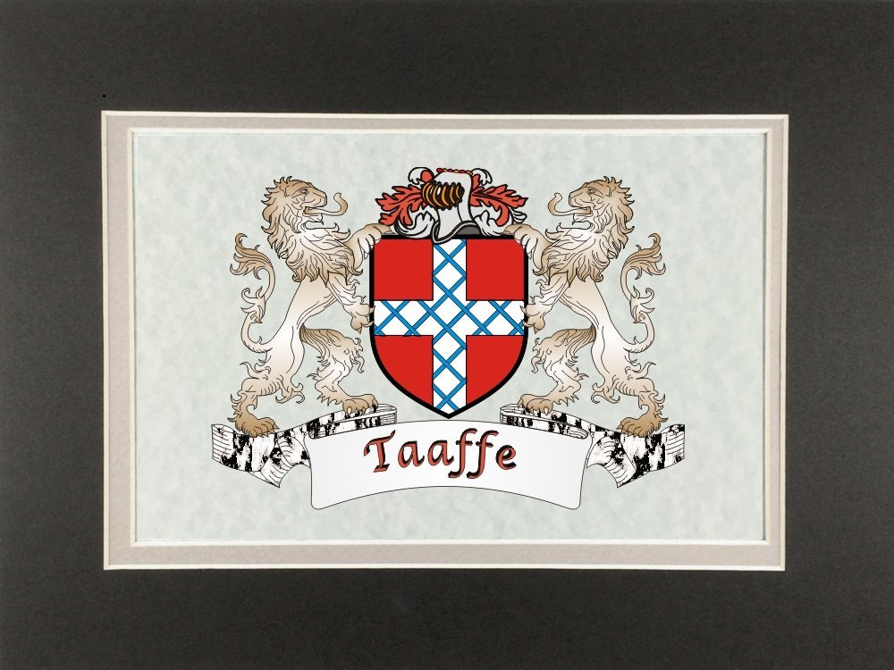 Taaffe Irish Coat of Arms Print - Frameable 9" x 12" Authentic Irish coat of arms frameable 9" x 12" inch print. Four piece set includes a high-quality print of your Irish family coat of arms on a heavy 65lb cover weight parchment paper, heavy all-black backing board, and TWO separate matboards. Fits any standard 9" x 12" frame. Authentic Irish coat of arms printPrinted from high quality Vector art filesHeavy duty all-black backing boardNo mounting necessaryTwo separate matboards (inside color: clay, outside color: dark olive)9" x 12" frameable sizeShrink wrapped for deliveryChoose from over 1200 available Irish coat of arms.