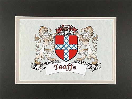 Product description: Taaffe Irish Coat of Arms Print - Frameable 9" x 12" Authentic Irish coat of arms frameable 9" x 12" inch print. Four piece set includes a high-quality print of your Irish family coat of arms on a heavy 65lb cover weight parchment paper, heavy all-black backing board, and TWO separate matboards. Fits any standard 9" x 12" frame. Authentic Irish coat of arms printPrinted from high quality Vector art filesHeavy duty all-black backing boardNo mounting necessaryTwo separate matboards (inside color: clay, outside color: dark olive)9" x 12" frameable sizeShrink wrapped for deliveryChoose from over 1200 available Irish coat of arms.