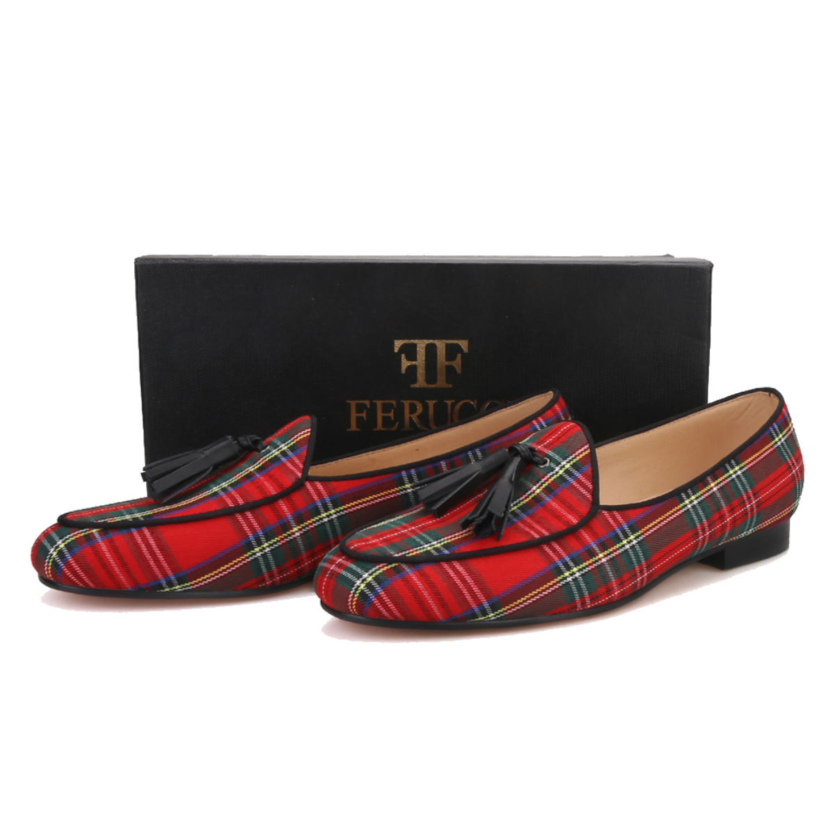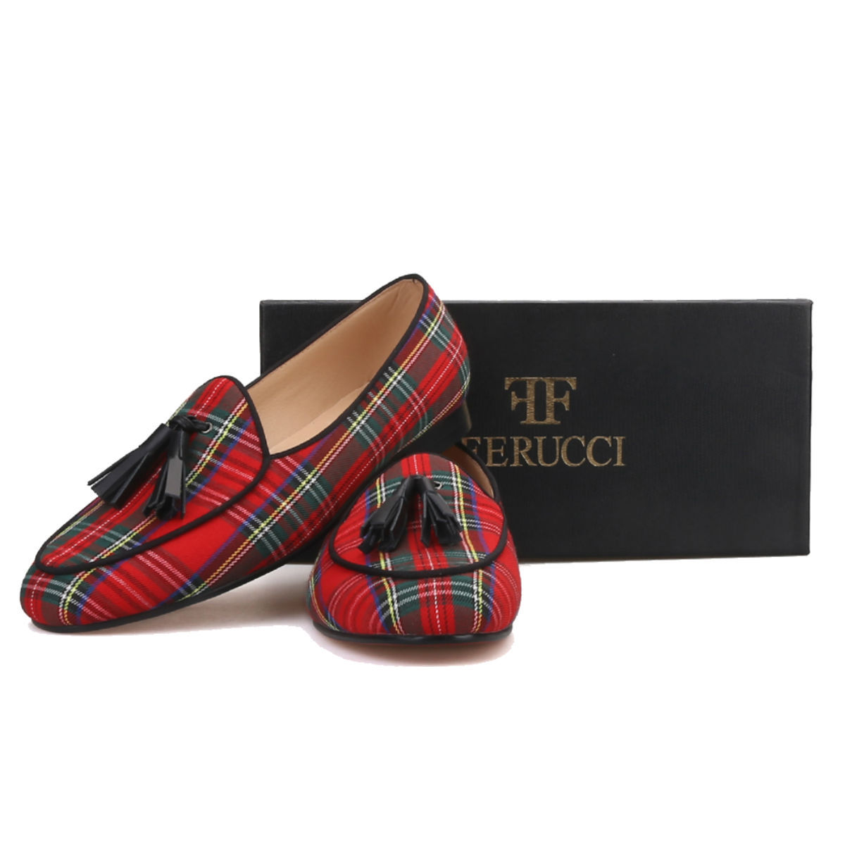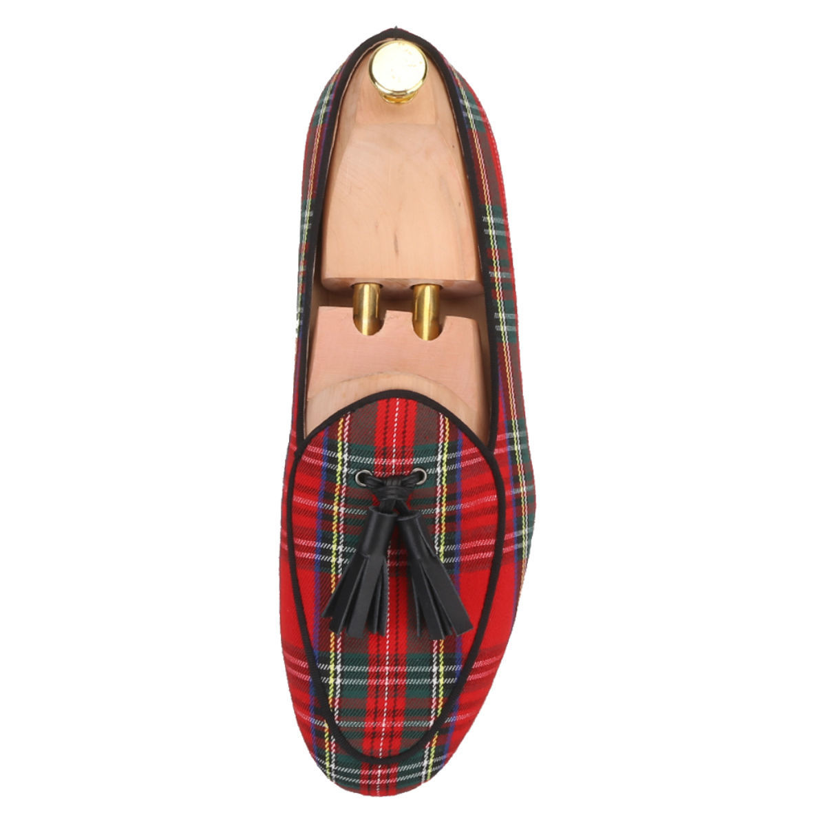 FERUCCI Scottish Red Custom-made Linen Slippers Loafers Flats with Black Tassel