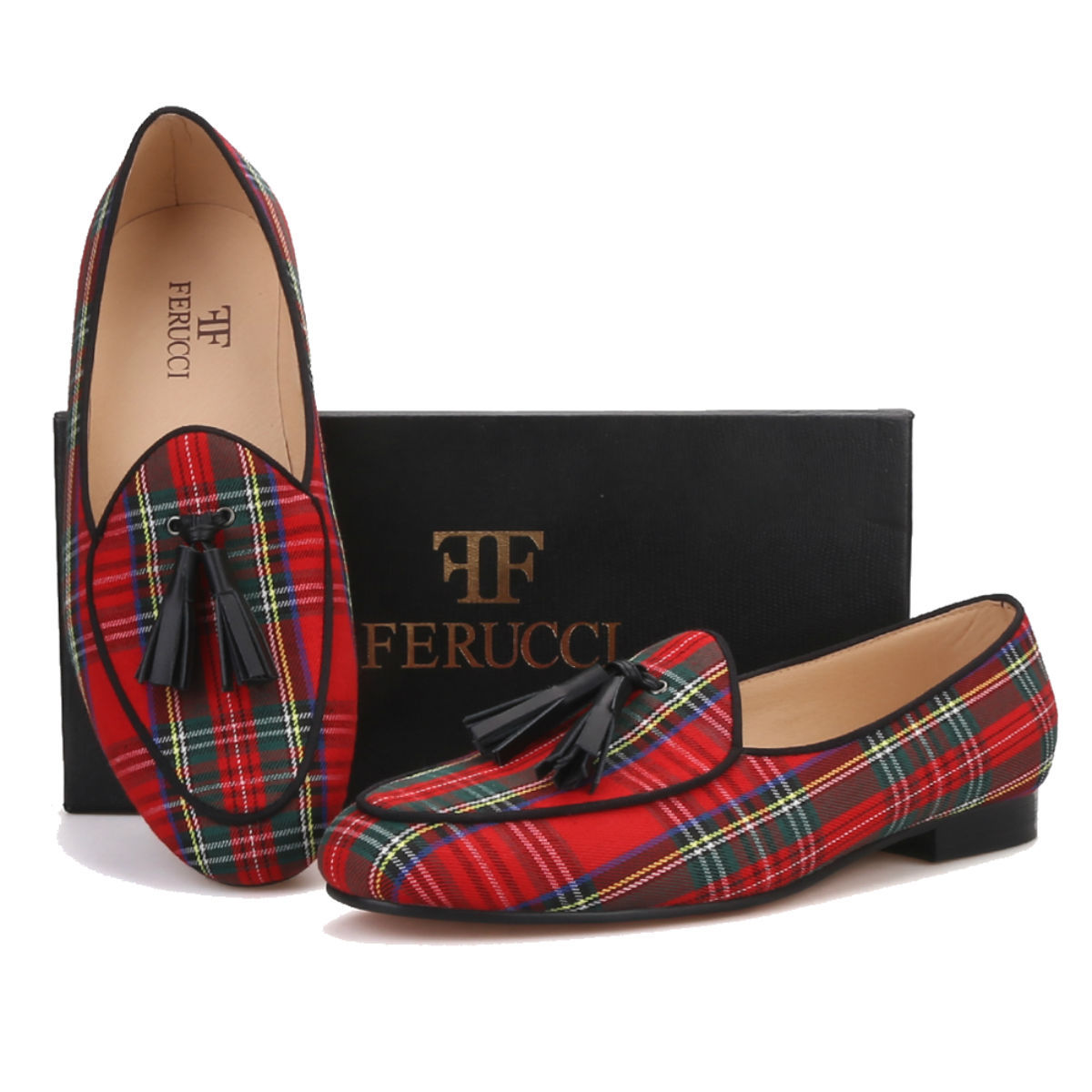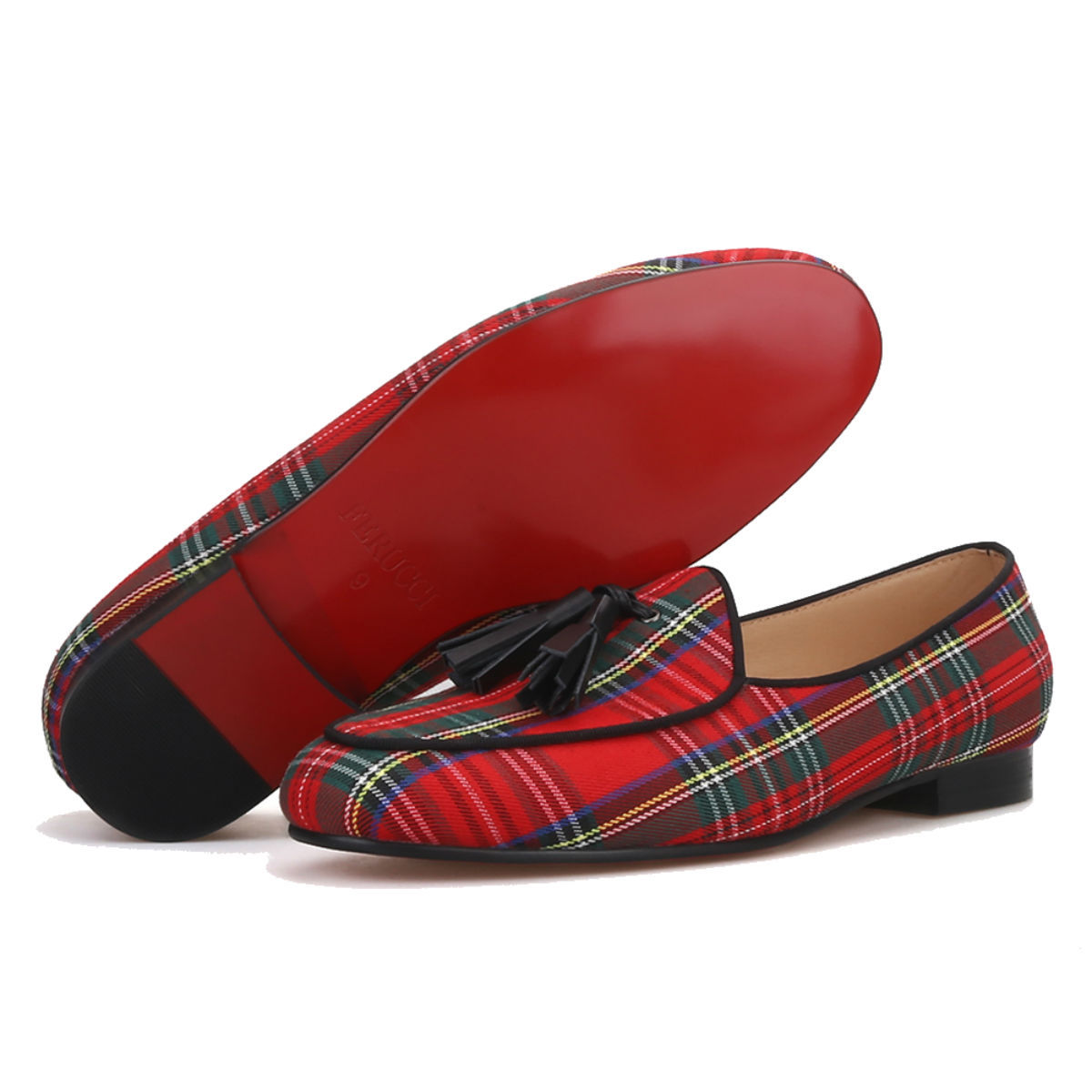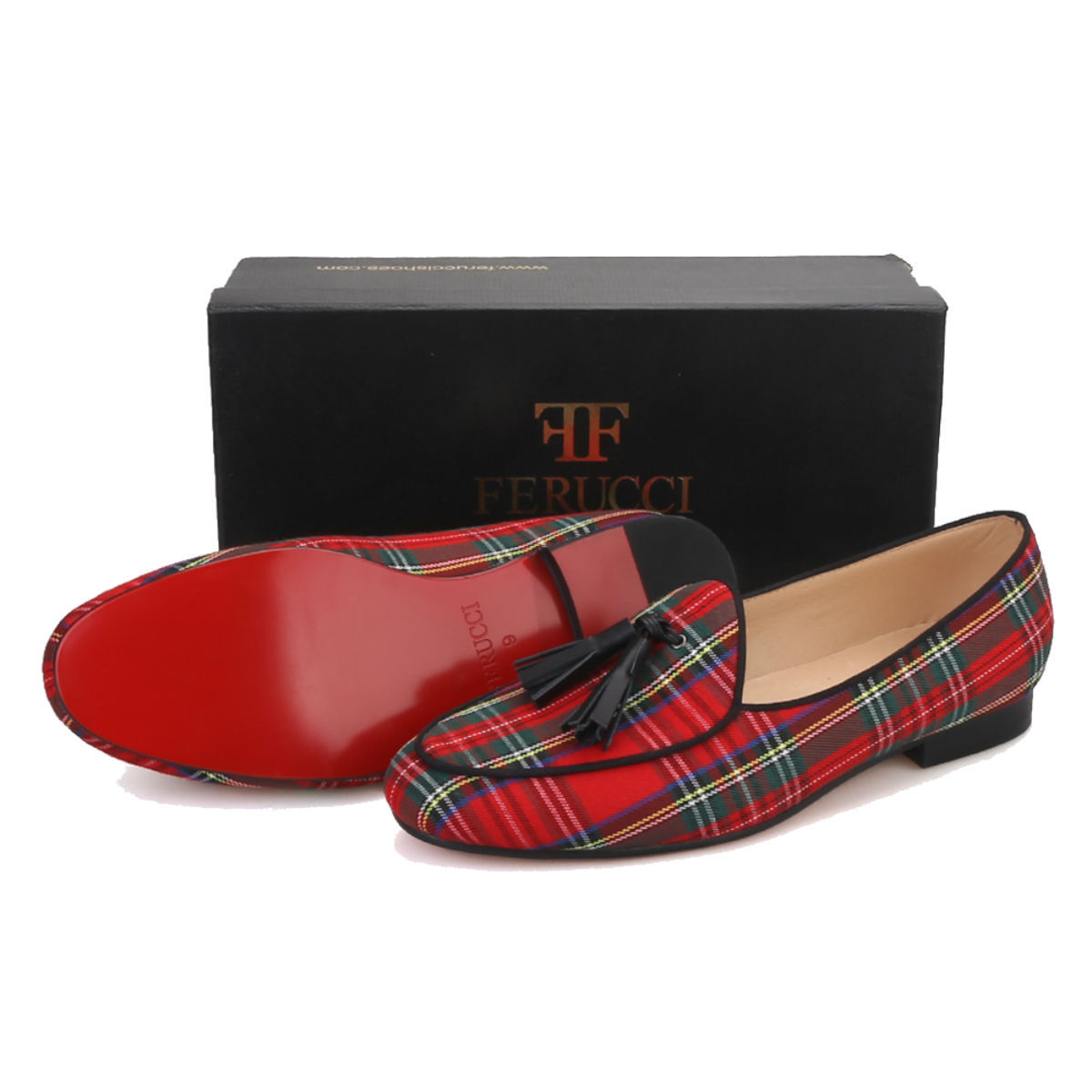 FERUCCI Scottish Red Custom-made Linen Slippers Loafers Flats with Black Tassel