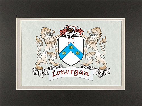 Lonergan Irish Coat of Arms Print - Frameable 9" x 12" Authentic Irish coat of arms frameable 9" x 12" inch print. Four piece set includes a high-quality print of your Irish family coat of arms on a heavy 65lb cover weight parchment paper, heavy all-black backing board, and TWO separate matboards. Fits any standard 9" x 12" frame. Authentic Irish coat of arms printPrinted from high quality Vector art filesHeavy duty all-black backing boardNo mounting necessaryTwo separate matboards (inside color: clay, outside color: dark olive)9" x 12" frameable sizeShrink wrapped for deliveryChoose from over 1200 available Irish coat of arms.