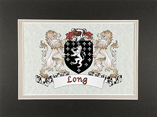 Long Irish Coat of Arms Print - Frameable 9" x 12" Authentic Irish coat of arms frameable 9" x 12" inch print. Four piece set includes a high-quality print of your Irish family coat of arms on a heavy 65lb cover weight parchment paper, heavy all-black backing board, and TWO separate matboards. Fits any standard 9" x 12" frame. Authentic Irish coat of arms printPrinted from high quality Vector art filesHeavy duty all-black backing boardNo mounting necessaryTwo separate matboards (inside color: clay, outside color: dark olive)9" x 12" frameable sizeShrink wrapped for deliveryChoose from over 1200 available Irish coat of arms.