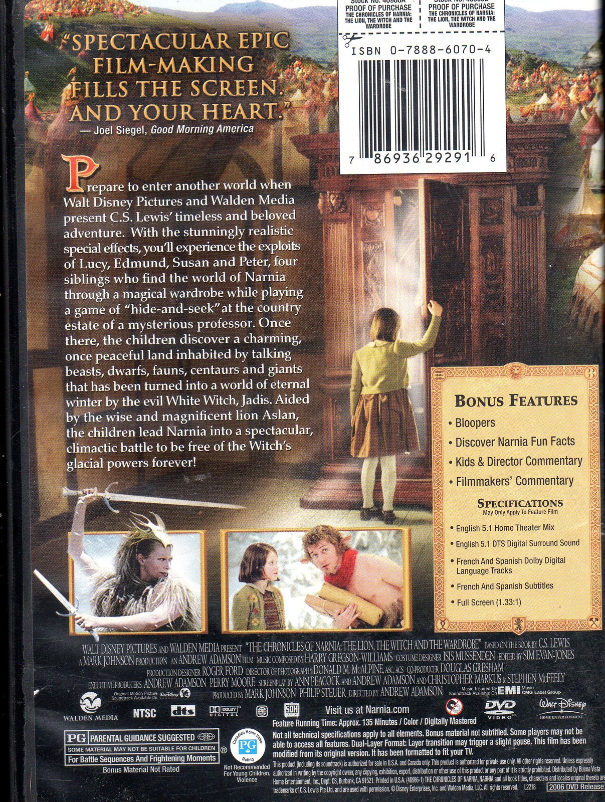 Go on an adventure for the ages with "The Chronicles of Narnia: The Lion, The Witch, and The Wardrobe" DVD. Staring Anna Popplewell, James McAvoy, and Tilda Swinton, this full-screen DVD follows four siblings as they enter Narnia through a magic wardrobe. It will have you on the edge of your seat as you watch the various adventures take place in Narnia. Along with the movie, you can watch bloopers and learn some fun Narnia facts. You can also listen to the audio commentary to learn more about this movie. The DVD is rated PG and is 135 minutes long. Question contact me.