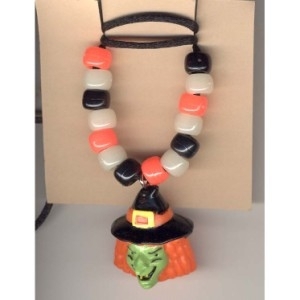 WITCH DECAPITATED HEAD AMULET PENDANT NECKLACE - Wicked Halloween, Scary Gothic Wiccan Charm Jewelry - 3d Mardi Gras, Holiday Charm. Colorful, 3-Dimensional, mini detailed plastic toy charm, approx. 1-1/4-inch diameter, on 24-inch Black satin rattail neck cord, with colorful acrylic beads mixed with translucent opaque Glow-inthe-Dark beads. Choose your bead and cord color! (Glow beads will be alternated with your color choice) *Please Note: We will send bead, cord color and length as described, if no options are chosen.