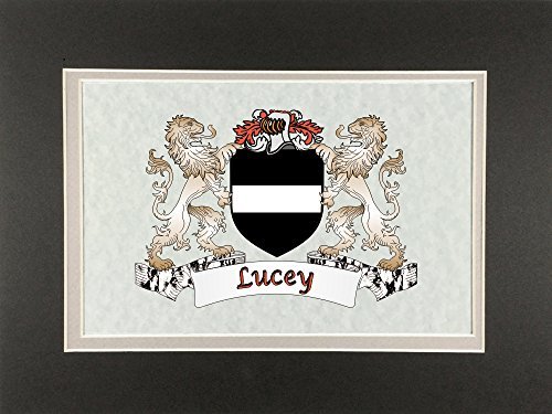 Lucey Irish Coat of Arms Print - Frameable 9" x 12" Authentic Irish coat of arms frameable 9" x 12" inch print. Four piece set includes a high-quality print of your Irish family coat of arms on a heavy 65lb cover weight parchment paper, heavy all-black backing board, and TWO separate matboards. Fits any standard 9" x 12" frame. Authentic Irish coat of arms printPrinted from high quality Vector art filesHeavy duty all-black backing boardNo mounting necessaryTwo separate matboards (inside color: clay, outside color: dark olive)9" x 12" frameable sizeShrink wrapped for deliveryChoose from over 1200 available Irish coat of arms.