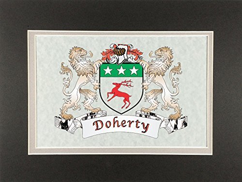 Doherty Irish Coat of Arms Print - Frameable 9" x 12" Authentic Irish coat of arms frameable 9" x 12" inch print. Four piece set includes a high-quality print of your Irish family coat of arms on a heavy 65lb cover weight parchment paper, heavy all-black backing board, and TWO separate matboards. Fits any standard 9" x 12" frame. Authentic Irish coat of arms printPrinted from high quality Vector art filesHeavy duty all-black backing boardNo mounting necessaryTwo separate matboards (inside color: clay, outside color: dark olive)9" x 12" frameable sizeShrink wrapped for deliveryChoose from over 1200 available Irish coat of arms.