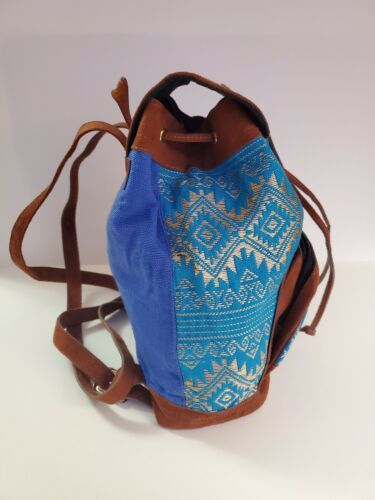 GUATEMALAN NATIVE BLUE TRIBAL HUIPIL AND LETHER BACKPACK ORIGINAL 100% HANDMADE