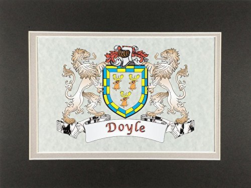 Doyle Irish Coat of Arms Print - Frameable 9" x 12" Authentic Irish coat of arms frameable 9" x 12" inch print. Four piece set includes a high-quality print of your Irish family coat of arms on a heavy 65lb cover weight parchment paper, heavy all-black backing board, and TWO separate matboards. Fits any standard 9" x 12" frame. Authentic Irish coat of arms printPrinted from high quality Vector art filesHeavy duty all-black backing boardNo mounting necessaryTwo separate matboards (inside color: clay, outside color: dark olive)9" x 12" frameable sizeShrink wrapped for deliveryChoose from over 1200 available Irish coat of arms.
