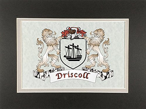 Driscoll Irish Coat of Arms Print - Frameable 9" x 12" Authentic Irish coat of arms frameable 9" x 12" inch print. Four piece set includes a high-quality print of your Irish family coat of arms on a heavy 65lb cover weight parchment paper, heavy all-black backing board, and TWO separate matboards. Fits any standard 9" x 12" frame. Authentic Irish coat of arms printPrinted from high quality Vector art filesHeavy duty all-black backing boardNo mounting necessaryTwo separate matboards (inside color: clay, outside color: dark olive)9" x 12" frameable sizeShrink wrapped for deliveryChoose from over 1200 available Irish coat of arms.