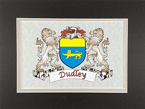 Dudley Irish Coat of Arms Print - Frameable 9" x 12" Authentic Irish coat of arms frameable 9" x 12" inch print. Four piece set includes a high-quality print of your Irish family coat of arms on a heavy 65lb cover weight parchment paper, heavy all-black backing board, and TWO separate matboards. Fits any standard 9" x 12" frame. Authentic Irish coat of arms printPrinted from high quality Vector art filesHeavy duty all-black backing boardNo mounting necessaryTwo separate matboards (inside color: clay, outside color: dark olive)9" x 12" frameable sizeShrink wrapped for deliveryChoose from over 1200 available Irish coat of arms.