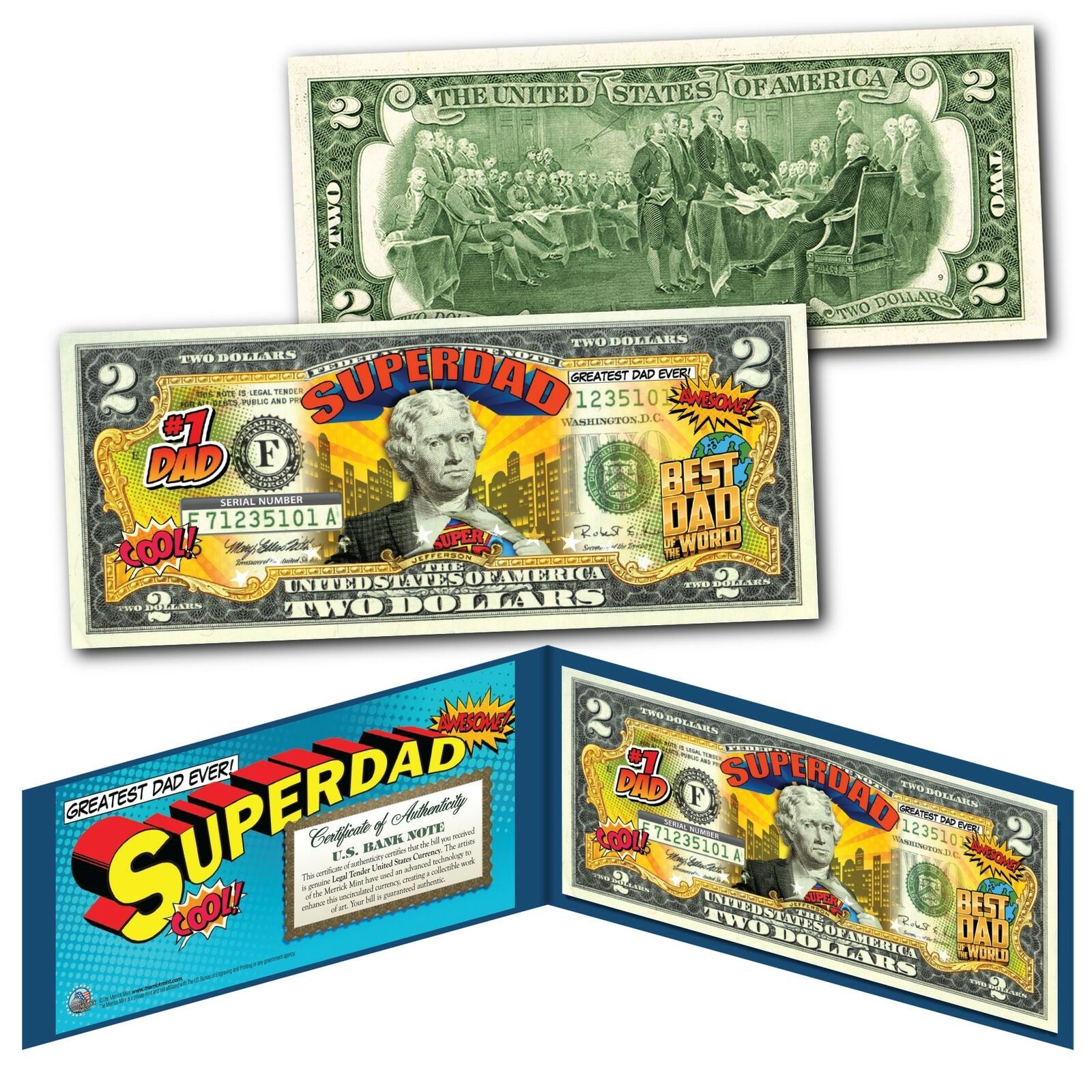 This SUPERDAD uncirculated $2 Bill is Genuine Authentic Legal Tender of the United States, which has been enhanced with beautiful colorized images. The full colorized images are accomplished through a revolutionary new authentic genuine colorization process pioneered by The Merrick Mint, creating a collectible work of art. Each bill comes displayed in a blue folio with a Certificate of Authenticity to guarantee that your bills are authentic and recognized by every monetary authority around the world, therefore assuring its Collector Edition status. Each $2 Bill is in FRESH, CRISP, UNCIRCULATED condition, and was directly removed from untouched wrapped Federal Reserve sealed packs. Former U.S. President Thomas Jefferson is featured on the obverse of the note, along with the special colorization overlay. The Signing of the Declaration of Independence by John Trumbull is featured on the reverse. It is the only U.S. Currency note that features two Presidents, John Adams and Thomas Jefferson, and it is one of the most rarely seen BILLS in circulation and actual use.