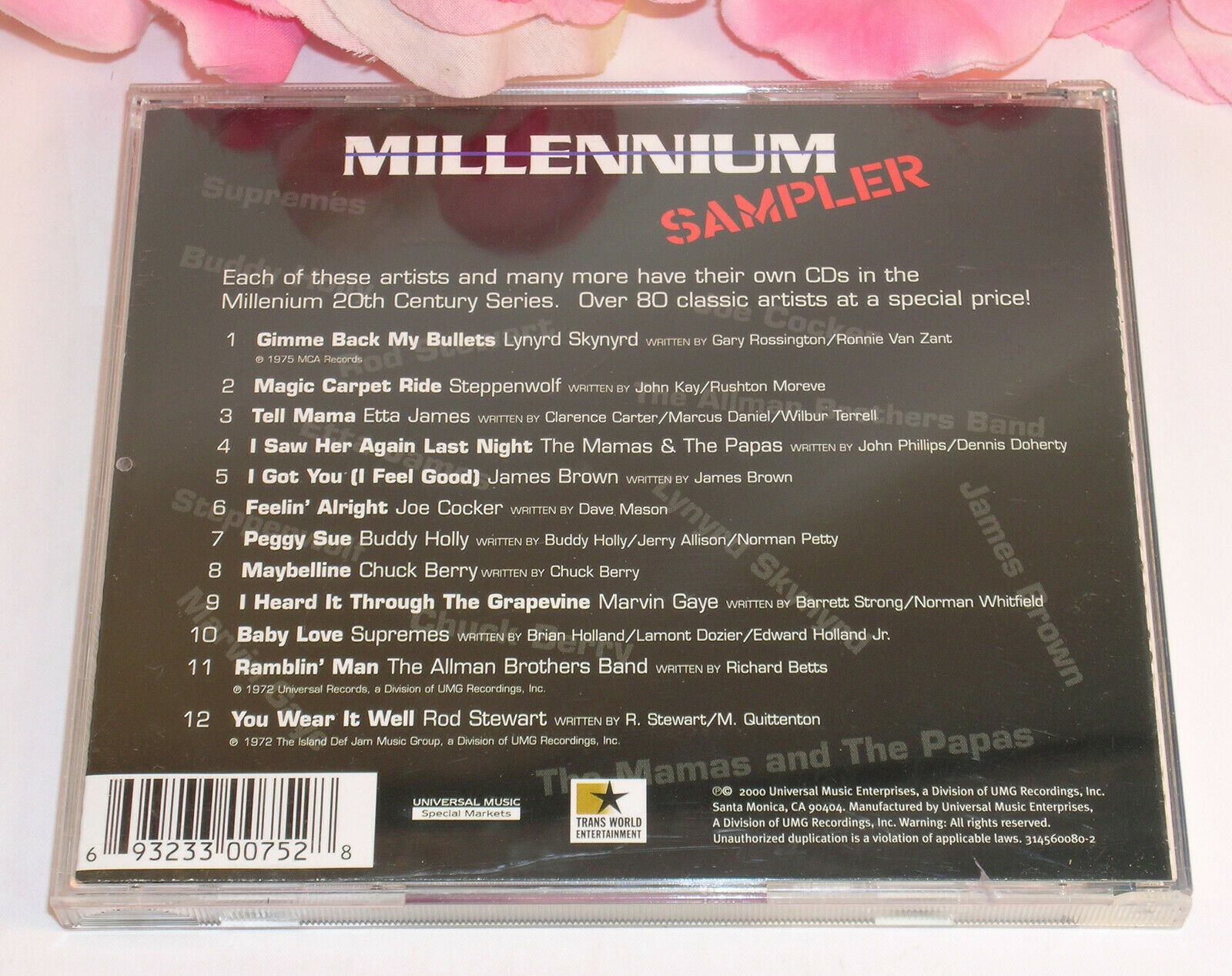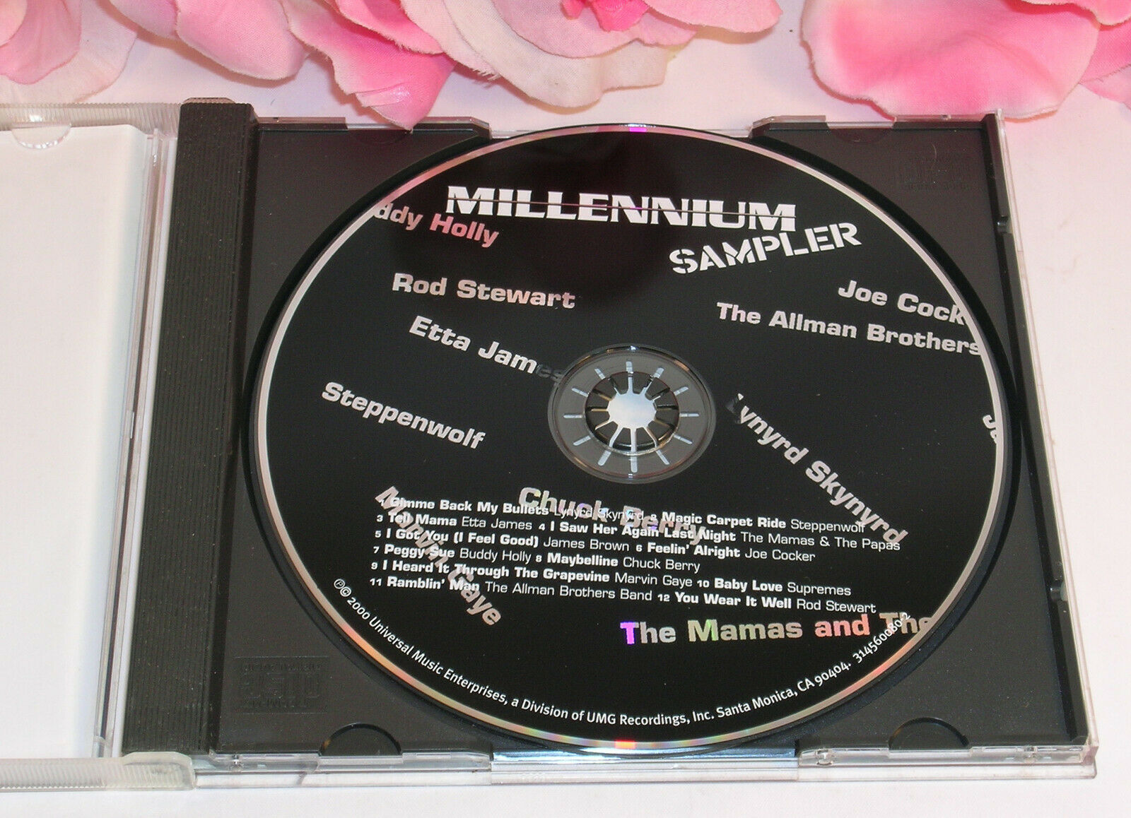 You are buying a gently used CD Millenium Sampler. The 20th Century masters. The best of Various Artists Joe Cocker, Steppenwoolf, Lynyrd Skynyer, Buddy Holly, Chuck Berry, Allaman Brothers, Rod Stewart and more. The CD is from Universal Music. This is a used CD that has 12 Tracks. The album was produced in 2000. The cd plays, there are no visible scratches. The cd is in the original case with inserts. Please look closely at the pictures for item condition.
