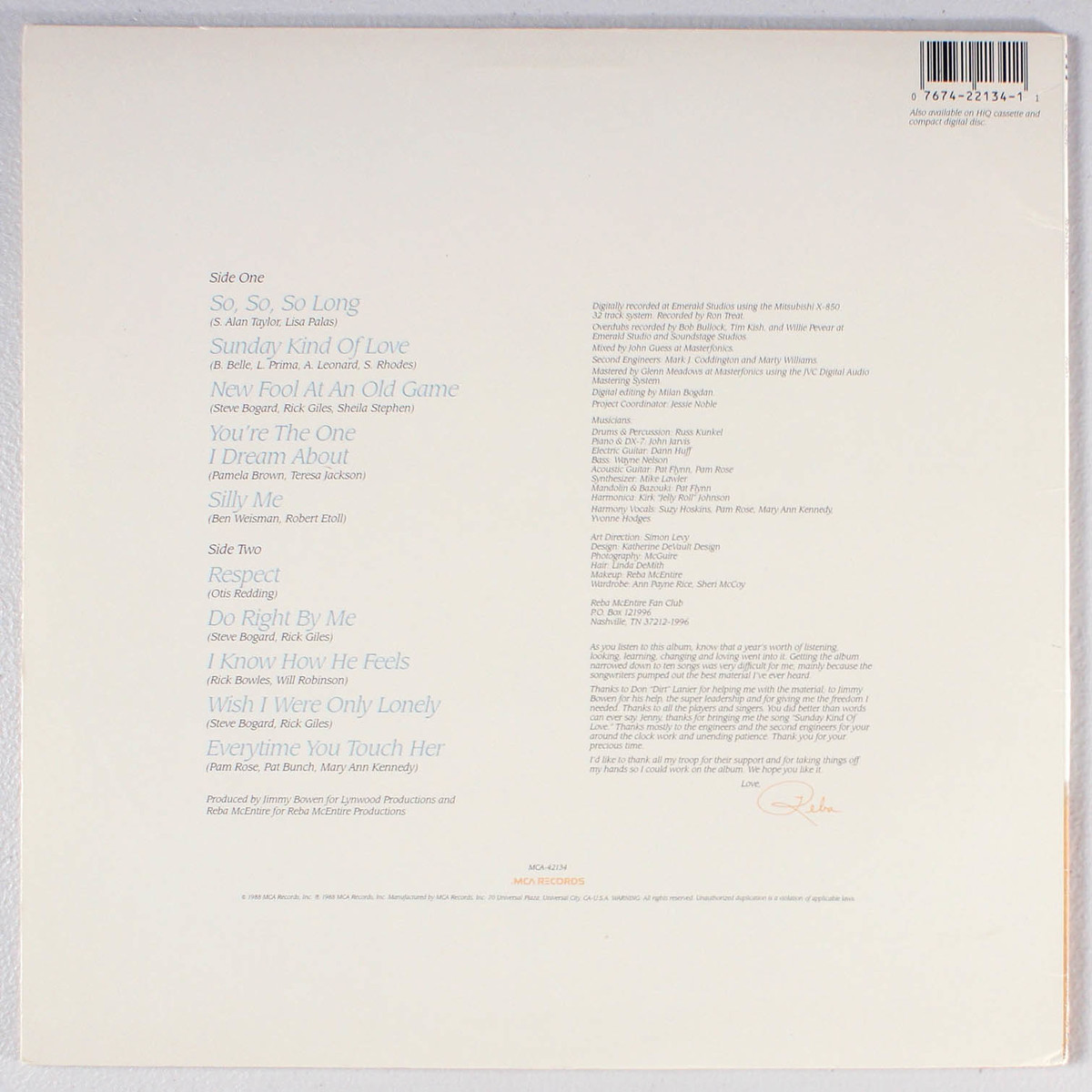 Reba, by country music singer Reba McEntire, signaled an entirely different style to her music. Gone were the honky tonk stable steel guitars and fiddles of My Kind of Country and Have I Got a Deal for You, to be replaced by a highly produced and orchestrated Bakersfield-like sound. This only enhanced the album's sales, as it was her third number 1 country album, and two of its tracks, I Know How He Feels and New Fool at an Old Game, reached number 1 on the Billboard country singles charts. A remake of an old jazz vocal standard made famous by Ella Fitzgerald, Sunday Kind of Love, reached the number 5 spot. Also covered was Respect,a song made famous by Aretha Franklin. The album stayed at number 1 for 6 consecutive weeks.