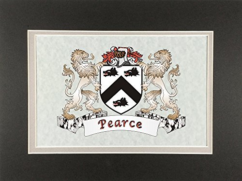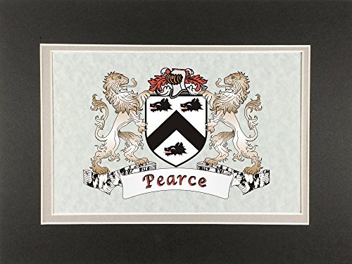 Product description: Pearce Irish Coat of Arms Print - Frameable 9" x 12" Authentic Irish coat of arms frameable 9" x 12" inch print. Four piece set includes a high-quality print of your Irish family coat of arms on a heavy 65lb cover weight parchment paper, heavy all-black backing board, and TWO separate matboards. Fits any standard 9" x 12" frame. Authentic Irish coat of arms printPrinted from high quality Vector art filesHeavy duty all-black backing boardNo mounting necessaryTwo separate matboards (inside color: clay, outside color: dark olive)9" x 12" frameable sizeShrink wrapped for deliveryChoose from over 1200 available Irish coat of arms.