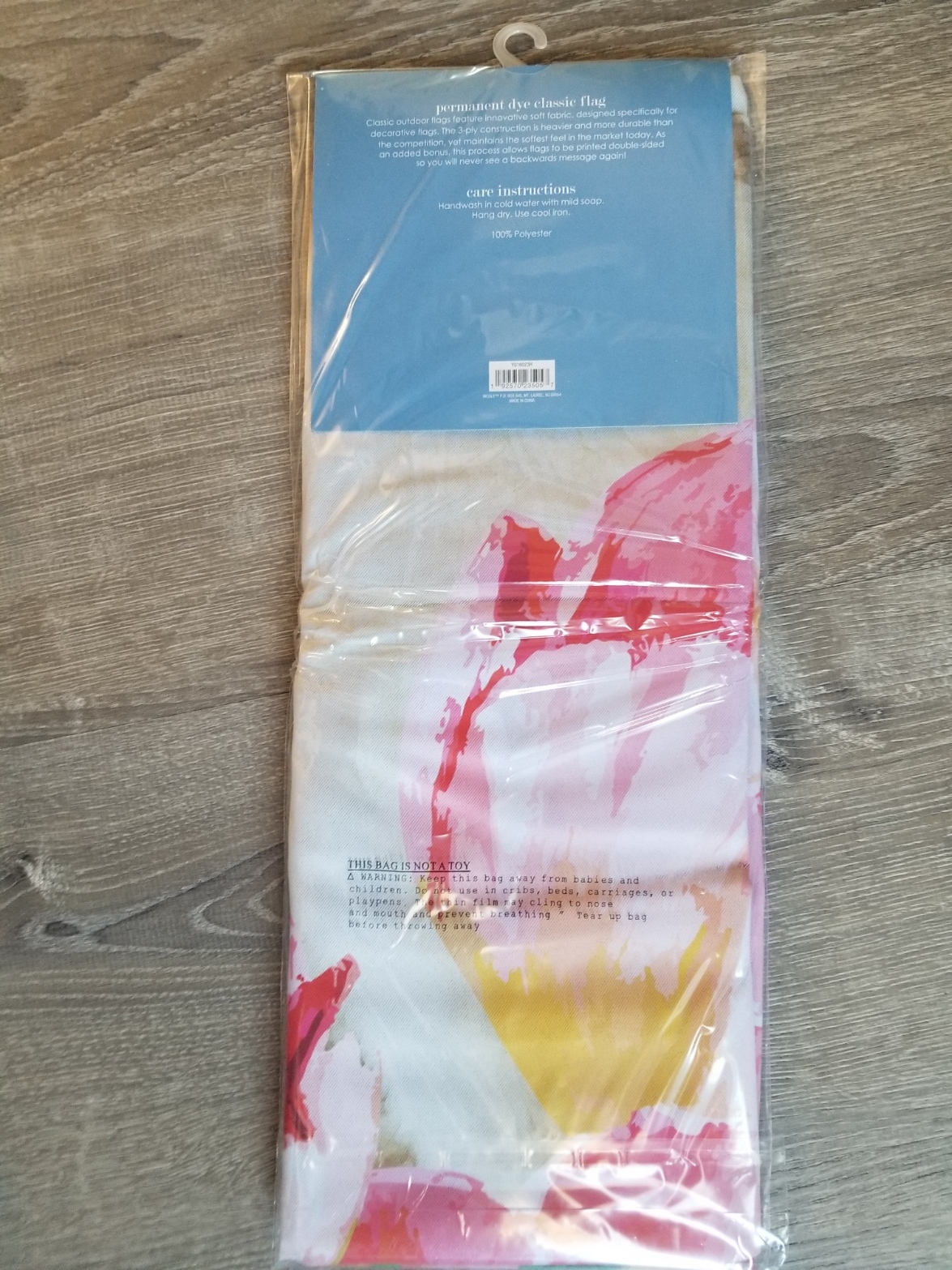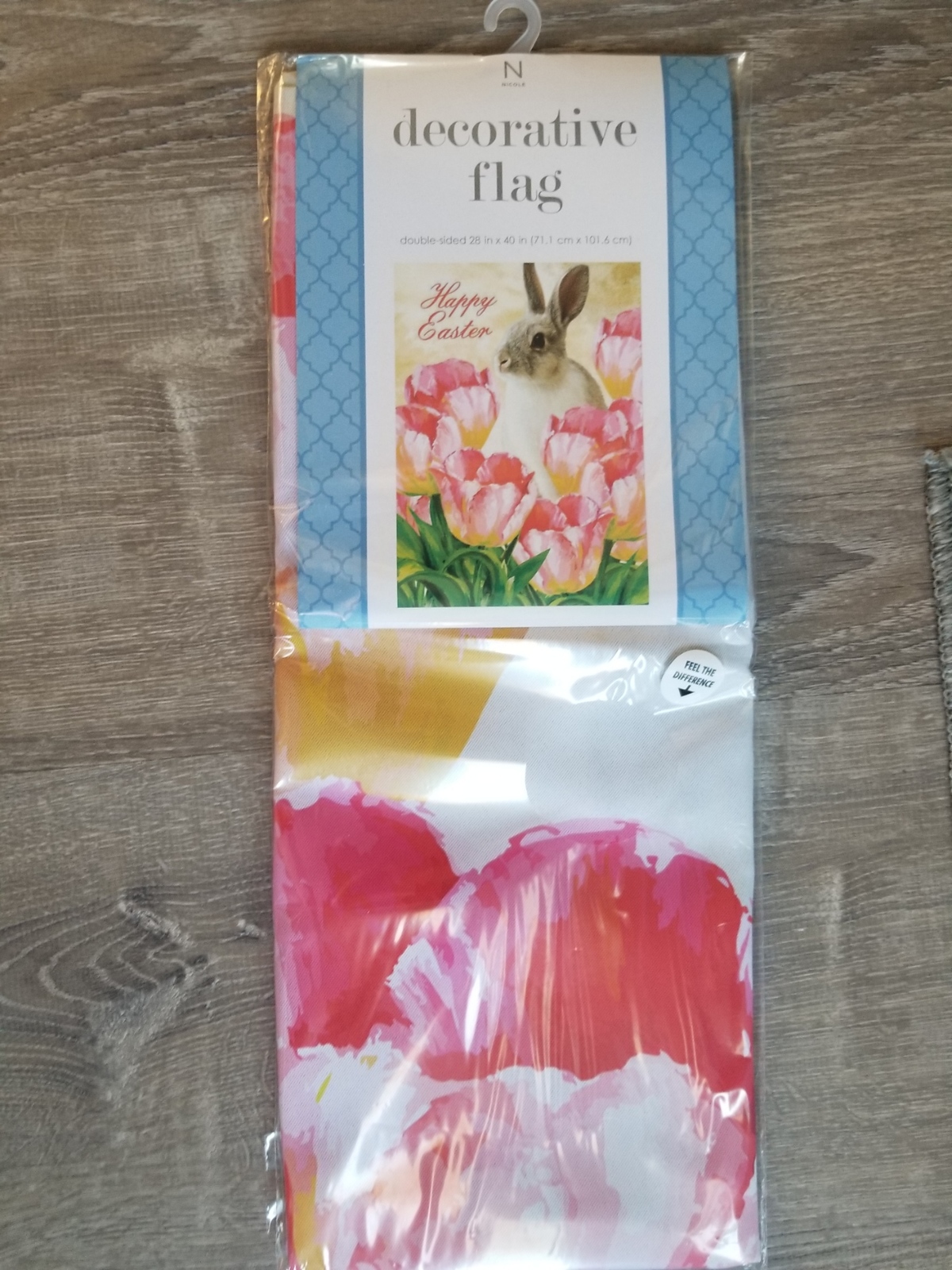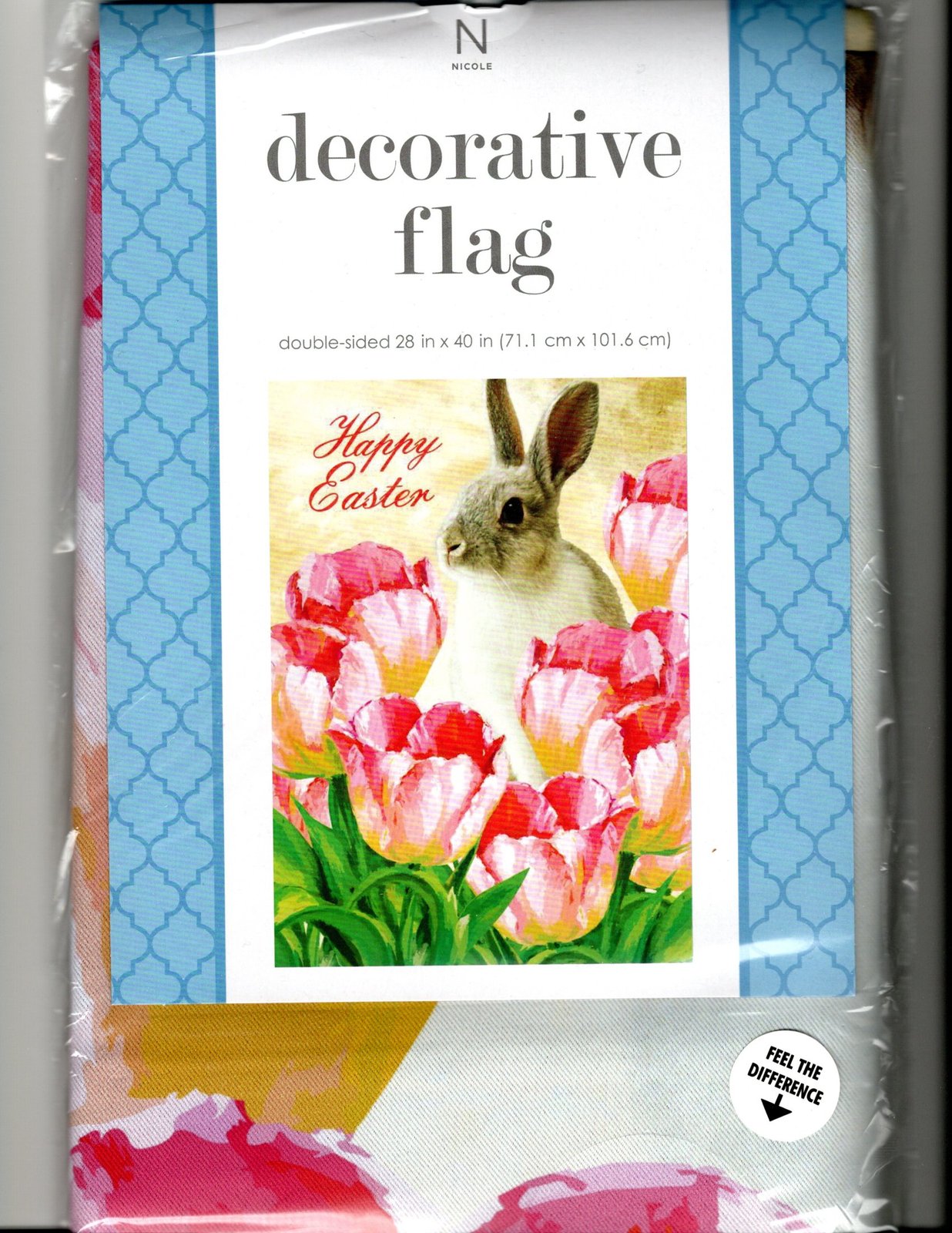 Tulips And Bunny House Flag measures 28" x 40" by Nicole. "Happy Easter" reads correctly on BOTH sides. This decorative Easter garden flag features a colorful design of colorful tulips with a bunny Vibrant colors and detailed outdoor yard flag that will complement any landscape. Pretty background with exceptional and unique design.Flag pole not included. Ships in 1-2 business days.