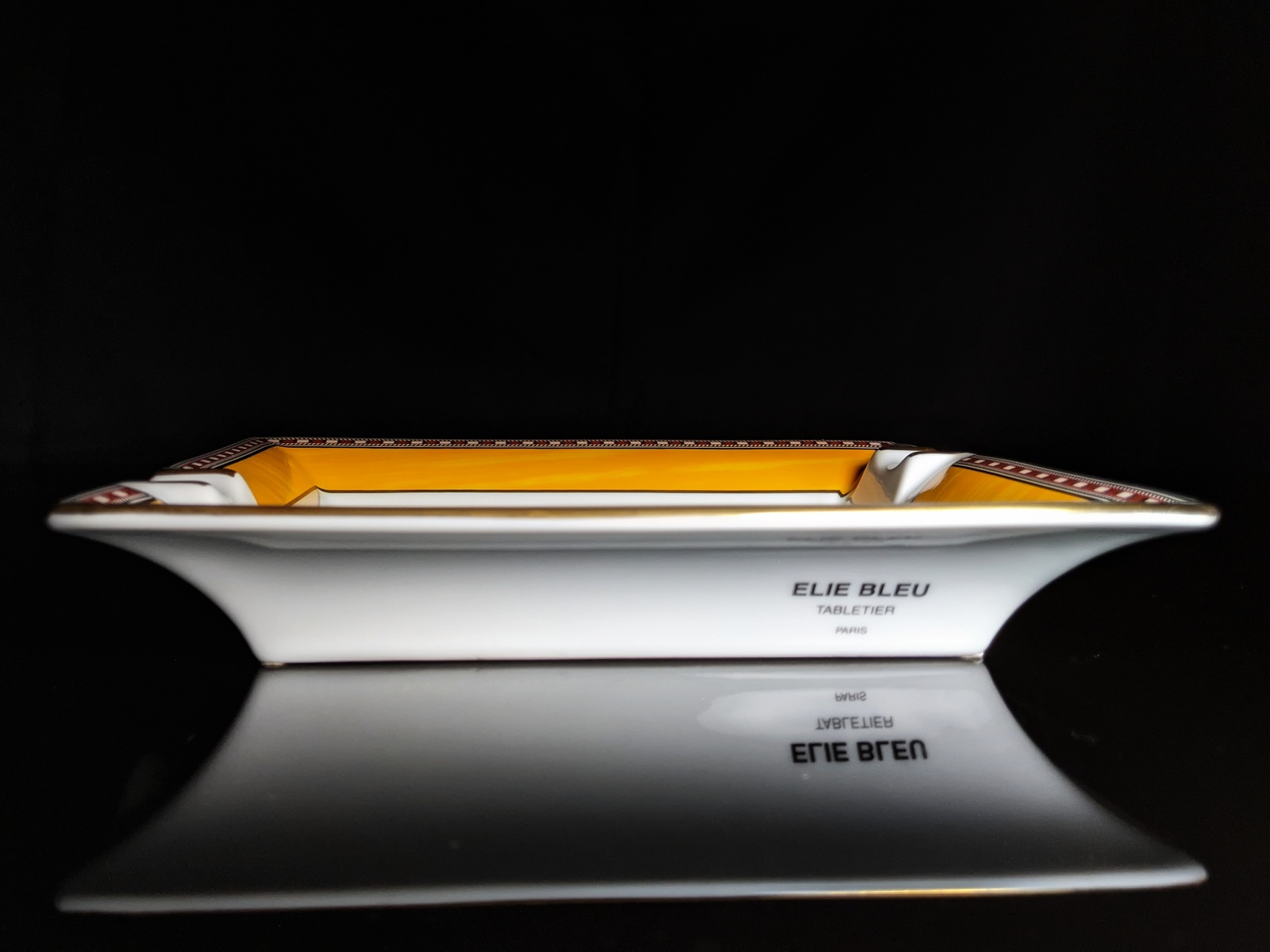 The ashtray is brand new and comes in its original packaging, making it perfect as a gift or for personal use. It is not a vintage item and has not been modified in any way. The featured refinements include the Elie Bleu logo and the beautiful yellow gold color, which adds a touch of luxury to any smoking experience. Add this stunning ashtray to your collection today.