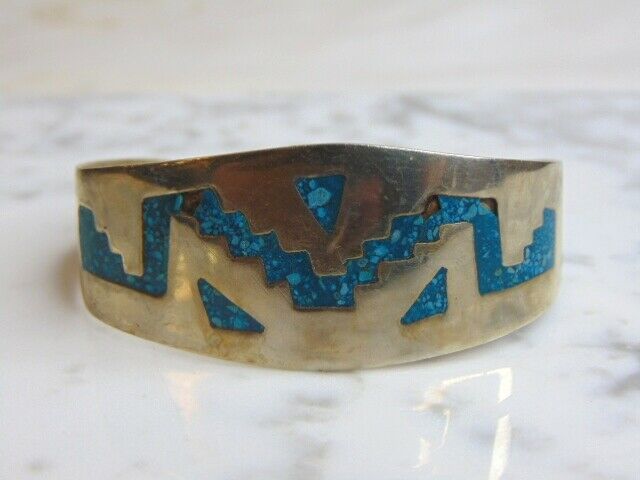 FOR SALE IS THIS BEAUTIFUL VINTAGE ESTATE .925 STERLING SILVER BRACELET WITH TURQUOISE INLAY. THE BRACELET WEIGHS 19.8g AND MEASURES 5 1/4" LONG BY 1" WIDE. THE CONDITION IS GOOD BUT AS YOU CAN SEE SOME OF THE TURQUOISE INLAY IS MISSING. BUYING AS IS. MAKES A GREAT GIFT FOR THAT SOMEONE SPECIAL. IF ANY QUESTIONS, PLEASE ASK. BE SURE TO CHECK OUT OUR OTHER ITEMS FOR SALE.