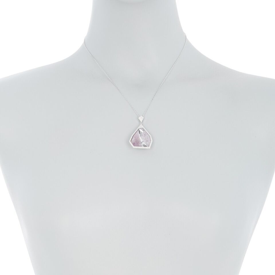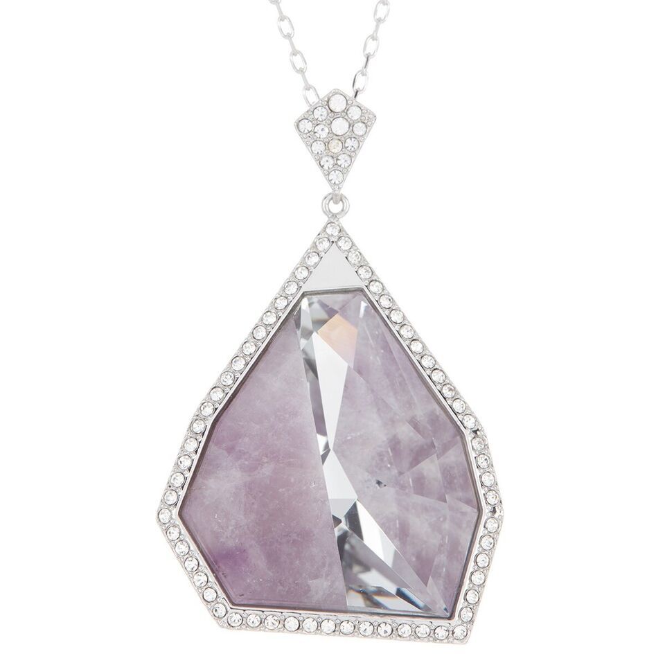 For the first time, Swarovski combines brilliance of Swarovski crystals with the beauty of gemstones. This rhodium-plated doublet pendant necklace features architectural purple amethyst gemstone and a crystal inside a small crystals pave frame. The stunning design is ideal for everyday wear or glamorous occasions, and would make a perfect gift.
