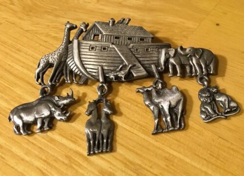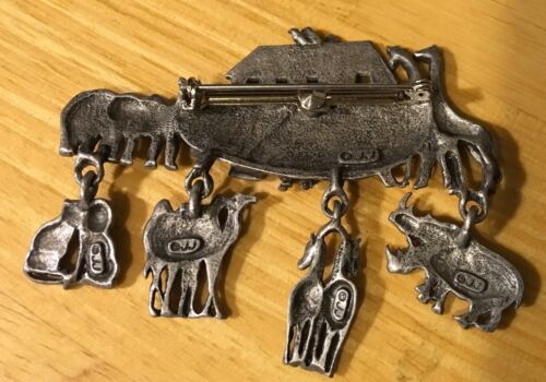 Flat silver or pewter looking JJ Noah?s Ark pin with animal dangles-rhino, horse, camel, lion. 2 3/4 inch long, just over 2 inches tall with the dangles. Very good condition.