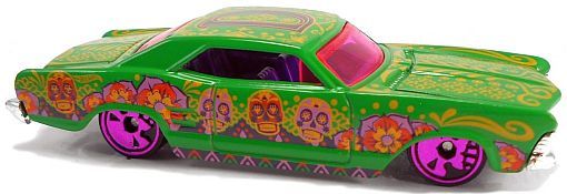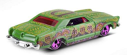 Description: Green w/Purple interior; Pink windows; Purple, Pink and Yellow Day of the Dead graphics on sides, hood, roof and trunk; Purple 'D' on roof; Yellow ‘Hot Wheels’ logo on rear sides; Chrome Malaysia Base w/PrplChrSKULL’s. 020620-020620P-D30
