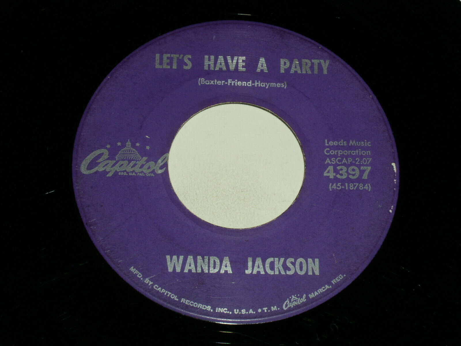 This is an original 45 rpm phonograph record by Wanda Jackson, entitled "Let's Have A Party". Flipside: "Cool Love". Record label: Capitol 4397.