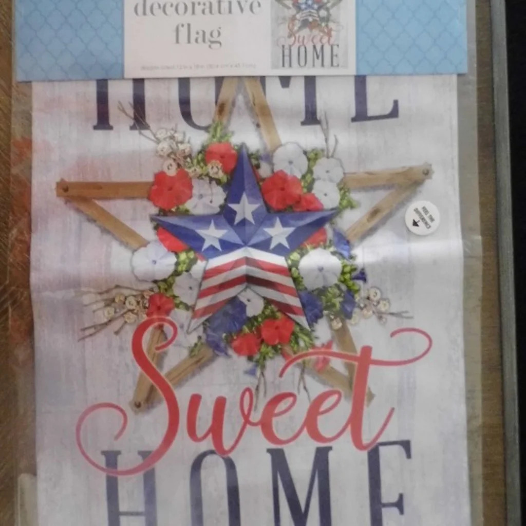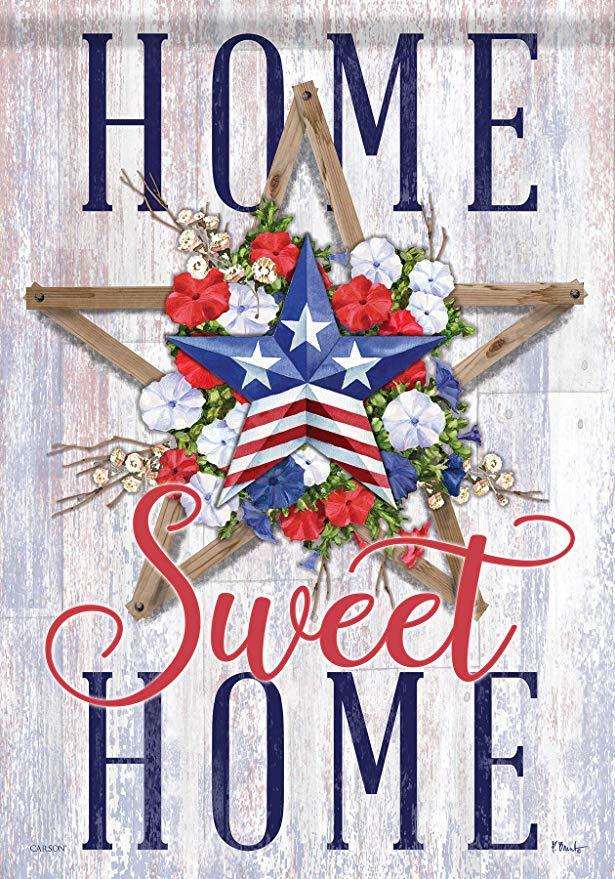 Patriotic Layers Garden Flag measures 12. 5" x 18". Colorful and bright patriotic design shows a wreath arrangement adorned with red/white/blue flowers. Text reads "HOME SWEET HOME". Design shows one or more of the following:Country Living, Barn Stars, Flowers, Love Happiness, Home Sweet Home. Decorative outdoor garden flag features artistic detail with vibrant colors. This unique decorative flag will complement your landscape and yard decor. Complete design by Paul Brent. Flag stand, pole, hardware or tray sold separately. Ships in 1-2 business days.