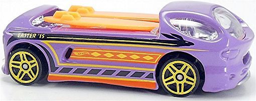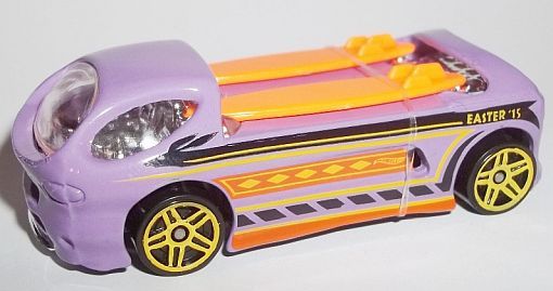 Description: Purple w/Chrome interior; Clear windows; Black, Orange, Yellow stripes w/'Easter '15' ‘Hot Wheels’ logo on sides; Orange surf boards; Black Thailand base w/YlwPR5’s. 021620-021620P-D28