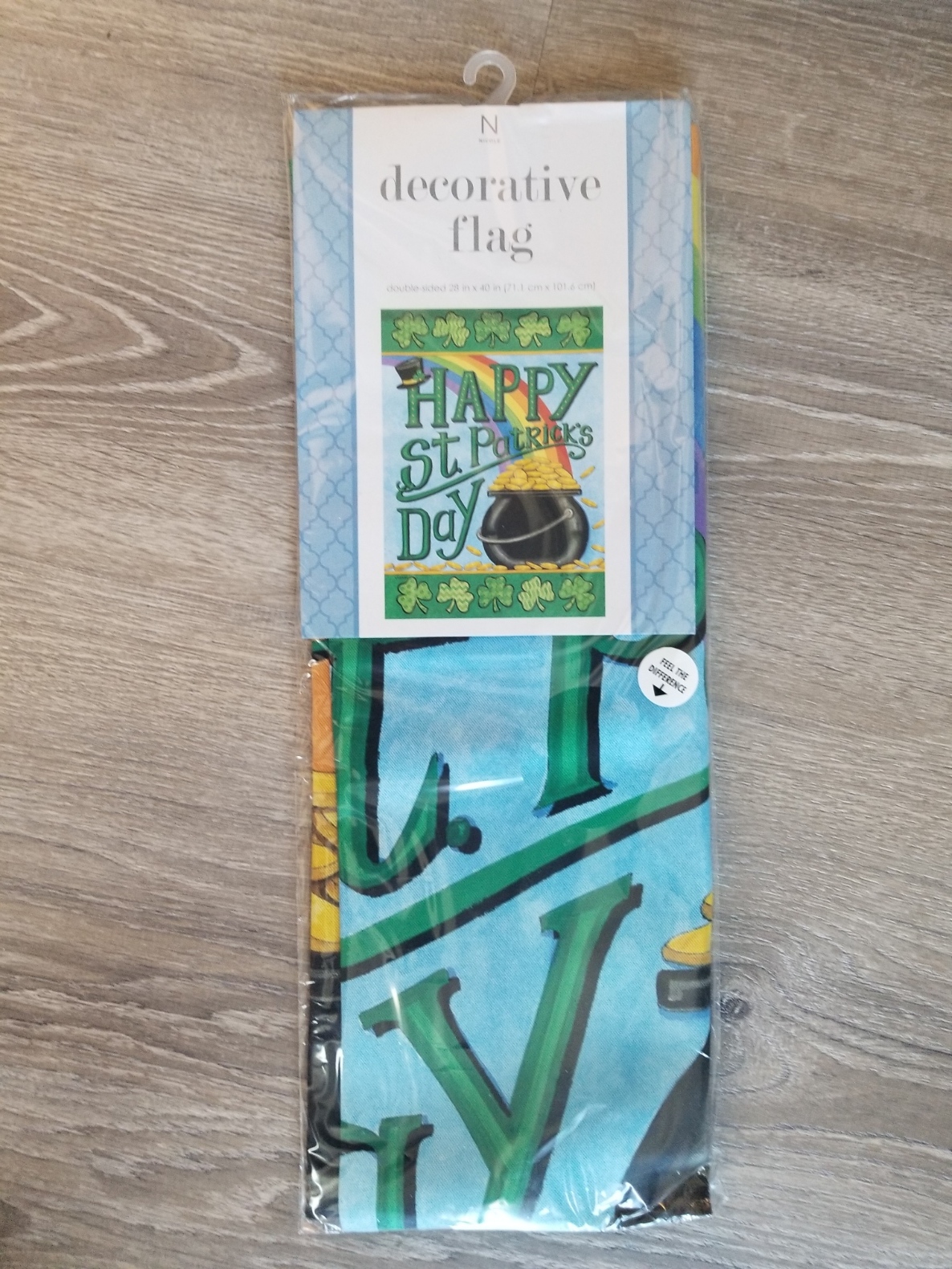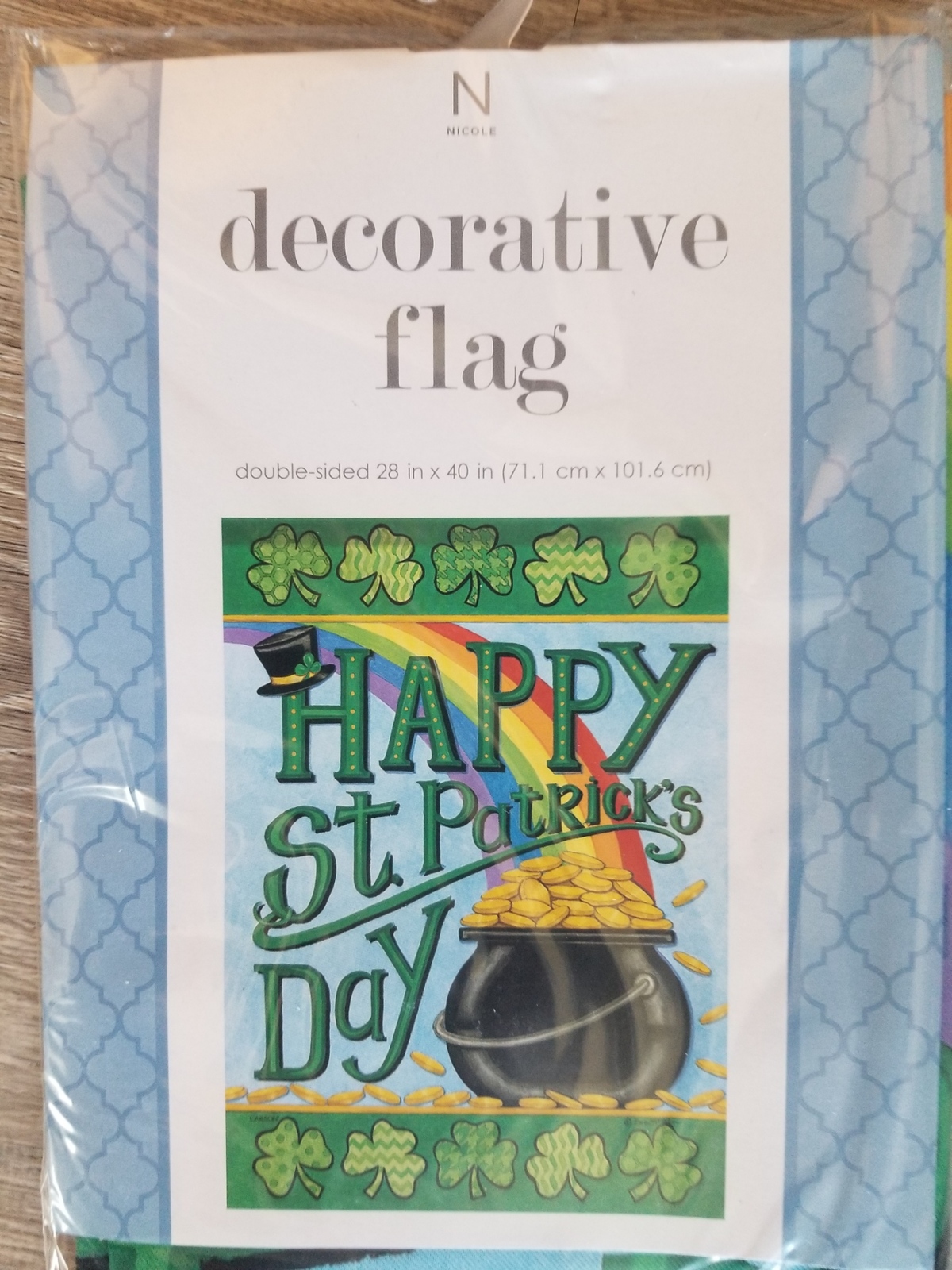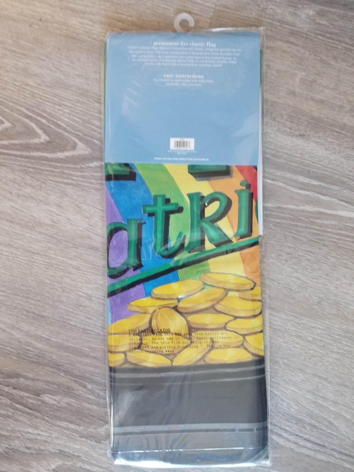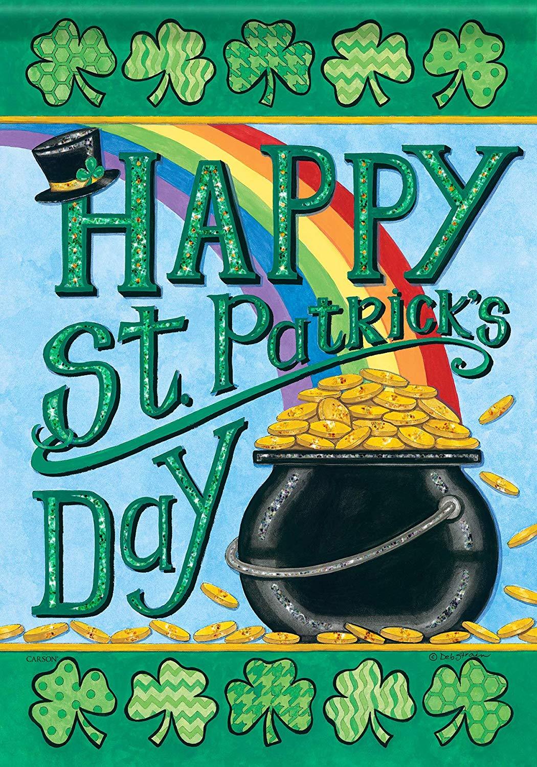 Rainbows Gold St Patrick's Day House Flag measures 28" x 40" by Carson. A glitzy design for St. Patrick's Day, features shamrocks/clovers, pot of gold and message "Happy St Patrick's Day". If there is text, all text reads correctly on both sides. This decorative Happy St. Patrick's Day house flag will welcome friends and family to your home. Colorful flag with artistic detail is designed to complement your landscape and yard decor. Pretty background with exceptional and unique design. Complete design by Deb Strain. Flag stand, pole, hardware or tray sold separately. Ships in 1-2 business days.