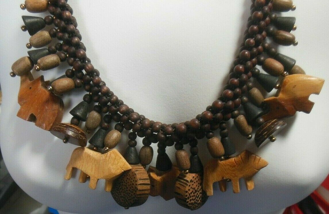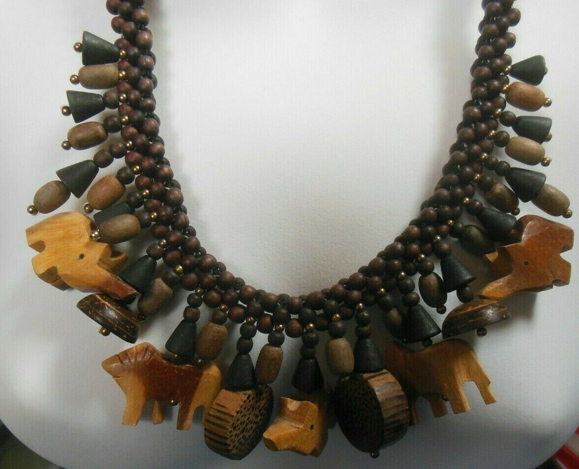 Vintage Safari Carved Wood Bead Cluster Dangle Statement Necklace Elephants, Lions