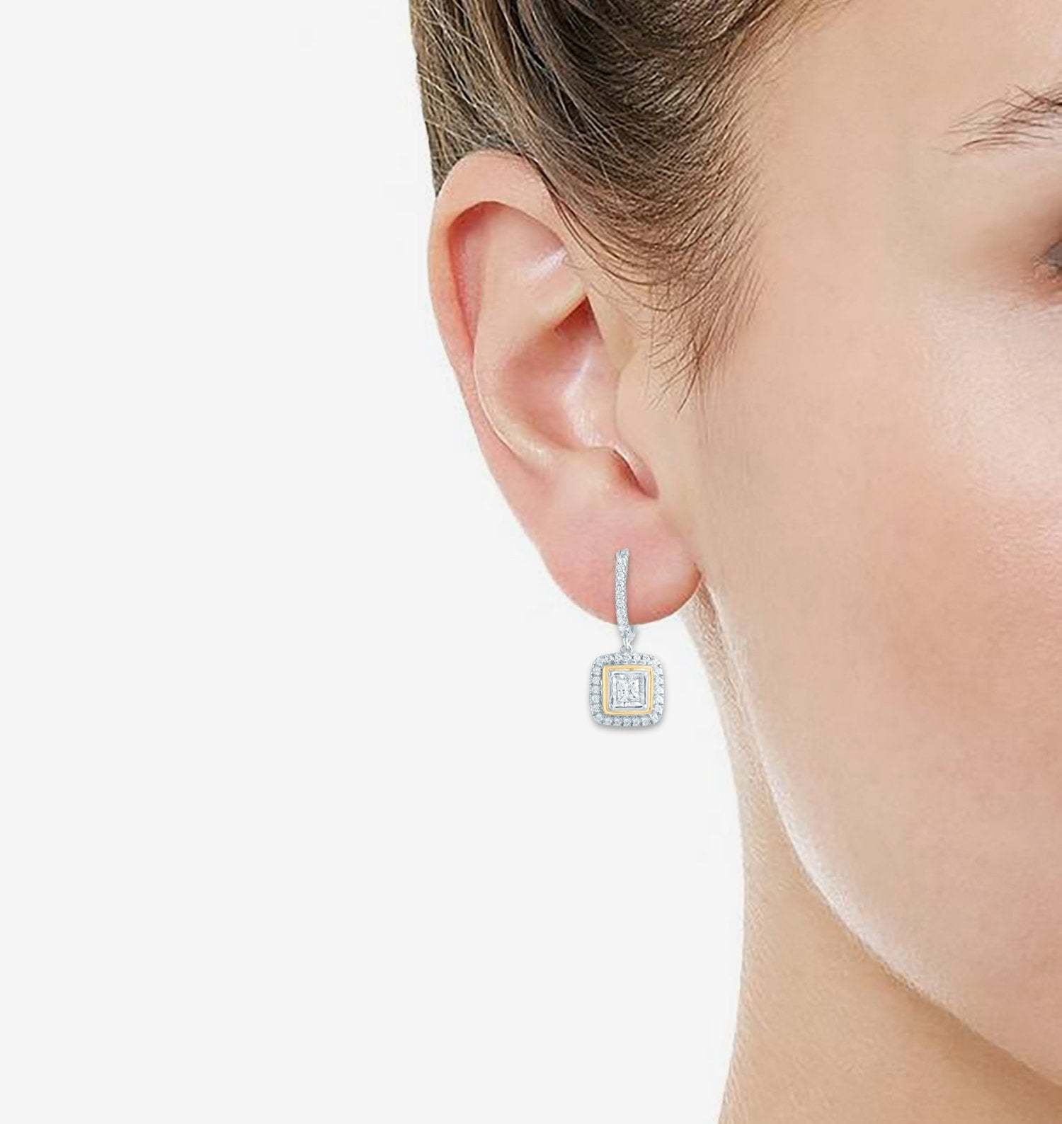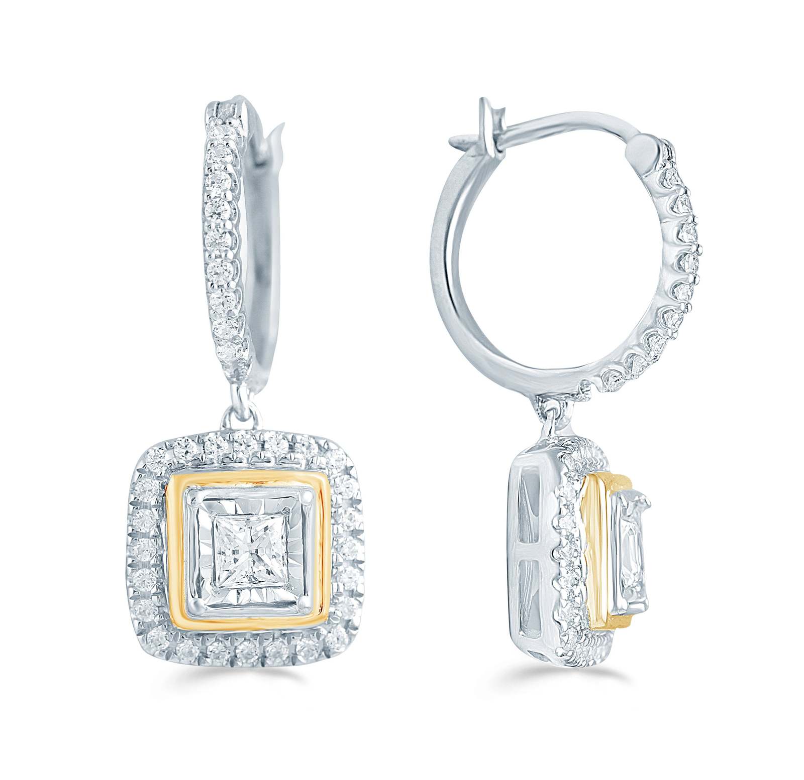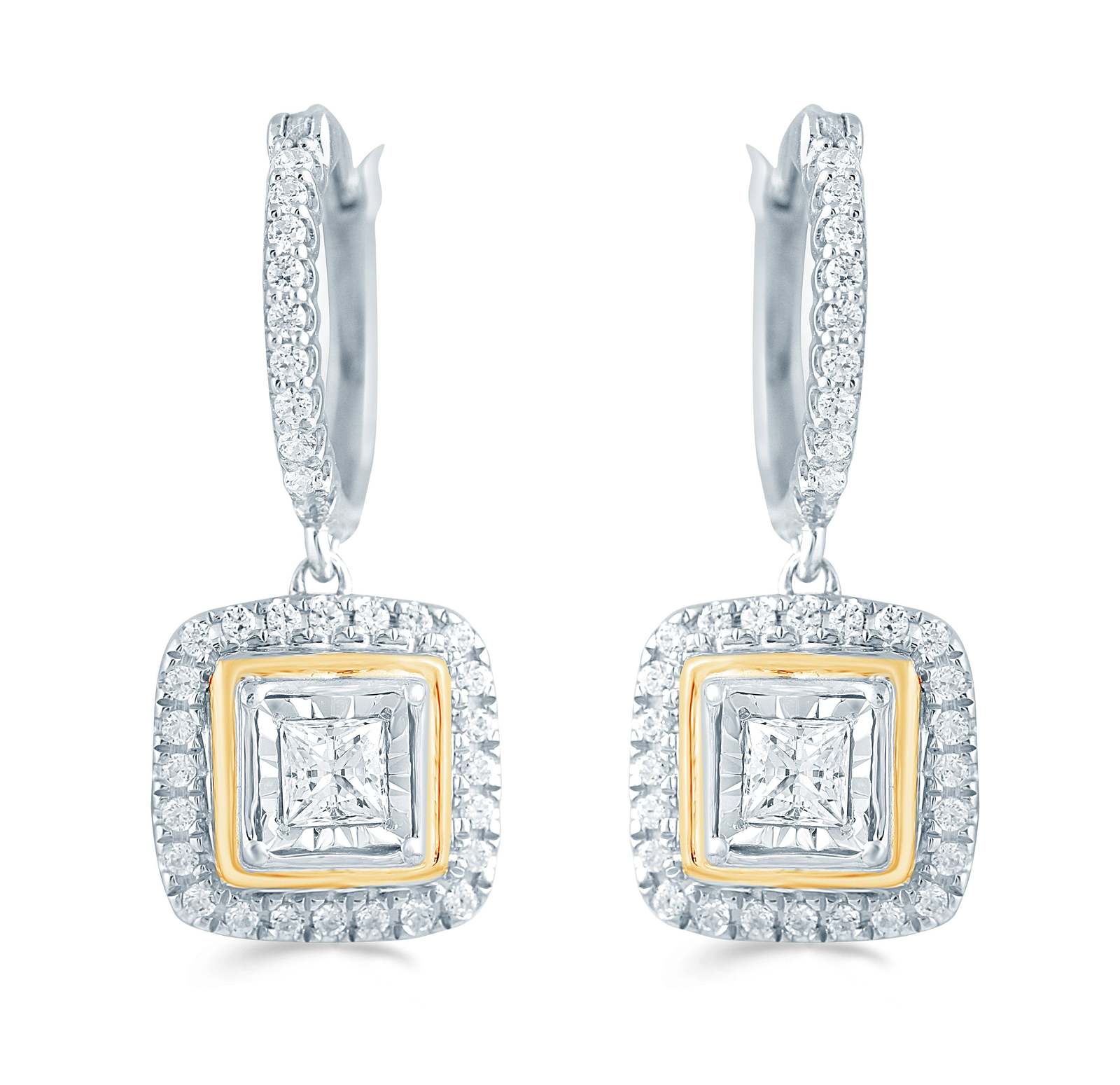 1/2CT.TW. Cushion Diamond Drop Earrings. Brilliantly Set with Princess Diamonds and a Silhouette of Yellow in Sterling Silver to Enhance it's Modern Shape.