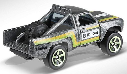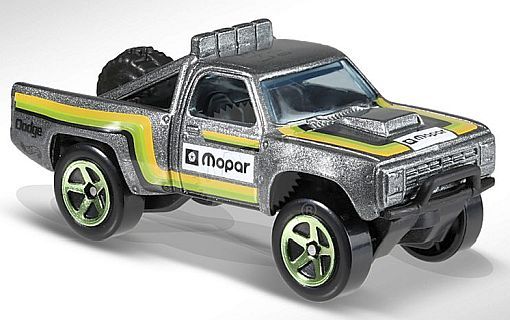Description: Mtlflk Gray w/Black interior; Blue windows; Yellow, Green Black tripes on sides hood; White rectangle w/Black ‘Mopar’ logo on hood doors; Black ‘Dodge’ logo ‘Hot Wheels’ logo on rear bedsides; Black Malaysia Base w/GreenChr5SP’s. 022420-022420P-D42