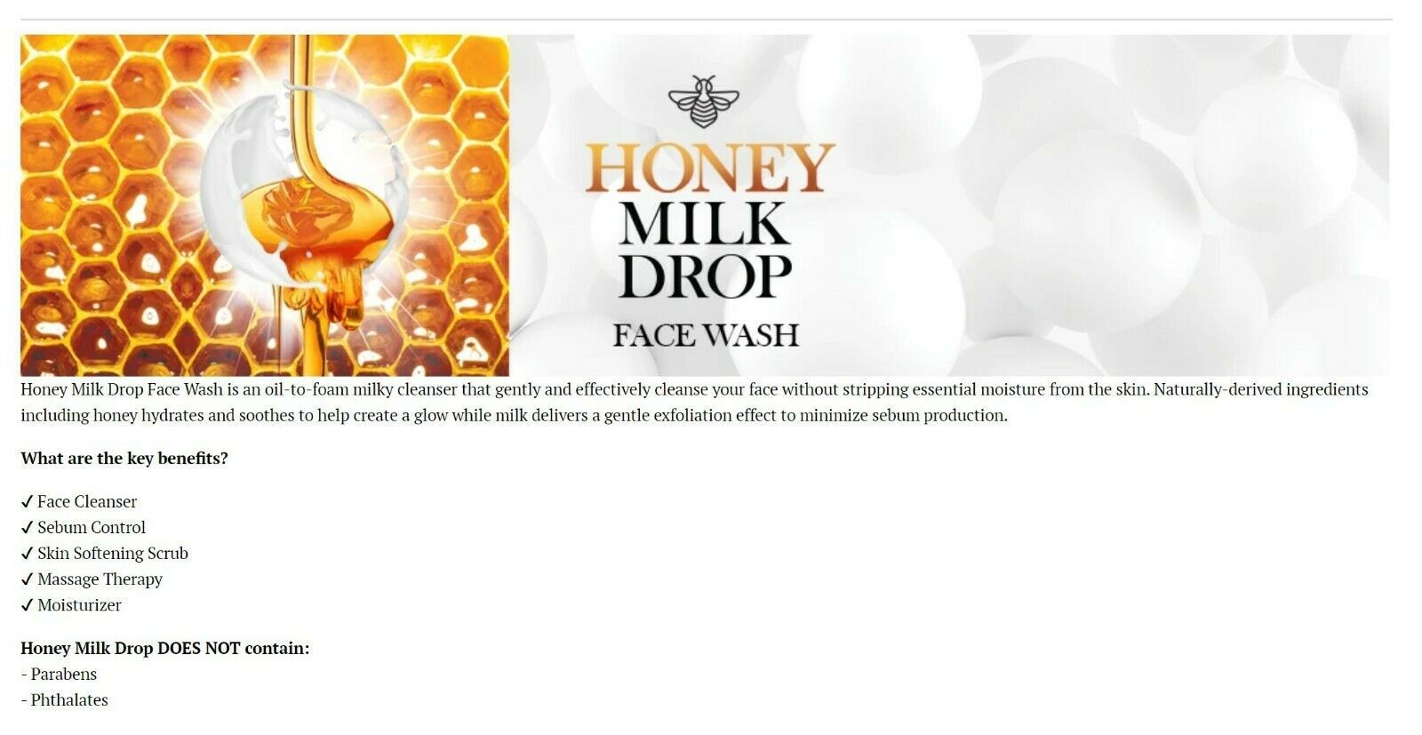 Honey Milk Drop Face Wash is an oil-to-foam milky cleanser that gently and effectively cleanse your face without stripping essential moisture from the skin. Naturally-derived ingredients including honey hydrates and soothes to help create a glow while milk delivers a gentle exfoliation effect to minimize sebum production. What are the key benefits? ? Face Cleanser ? Sebum Control ? Skin Softening Scrub ? Massage Therapy ? Moisturizer Honey Milk Drop DOES NOT contain: - Parabens - Phthalates