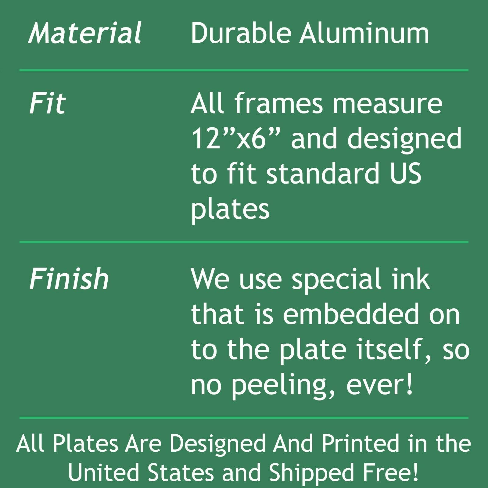 MCMP Customs license plate frames are made of premium quality and durable aluminum and backed by a 90 day warranty. Our frames and prints are water-resistant and acceptable in all seasons, rain or shine. They are car wash safe, rust resistant, and will not fade for years to come. We use special ink that is embedded on to the plate, so you never have to worry about anything peeling off.