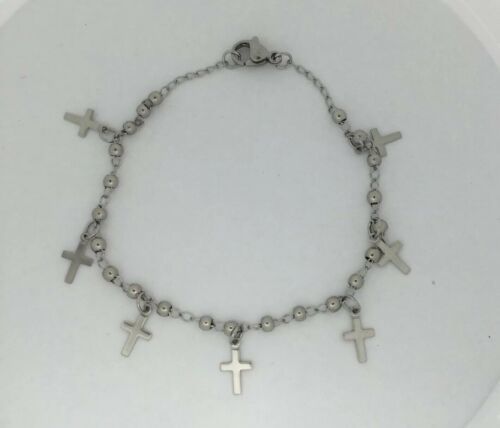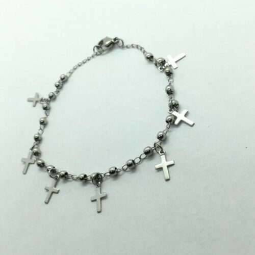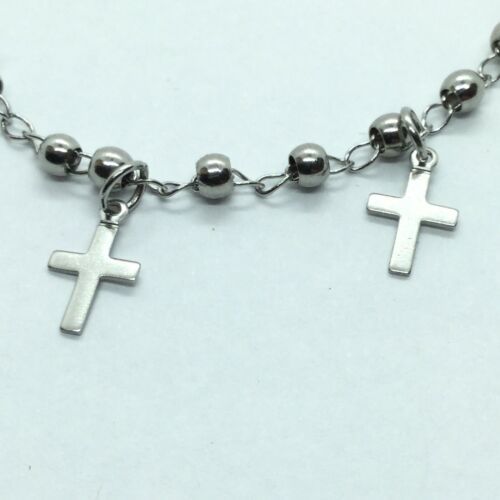 Catholic STAINLESS STEEL ROSARY CROSS BRACELET HANGING CROSS 8” Silver Tone.