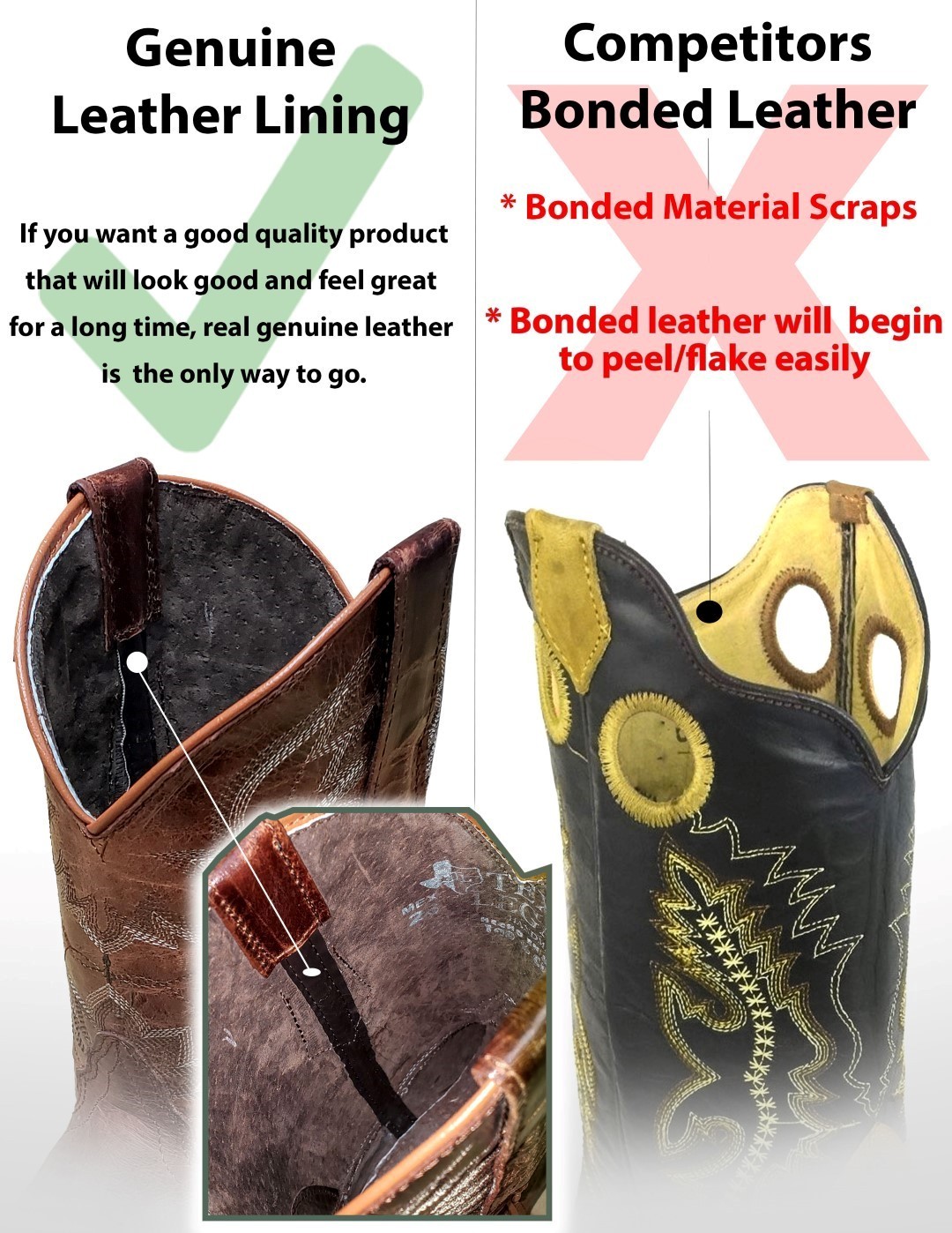 Description:Introducing Texas Legacy original and timeless boot collection. These boots are handcrafted and made to last. You can wear these solid leather cowboy boots anywhere and for any function. Always put your best foot forward in these Texas Legacy classic boots. This boot is handcrafted in Leon, Guanajuato, Mexico by some of the most experienced boot makers in the country. This boot features rubber soles for maximum traction in any condition or weather. Smooth full leather mid-soles and full leather lining provide a comfortable fit and a stylish look. Stacked leather heels that are well stitched and reinforced with brass nails, guarantee maximum durability.